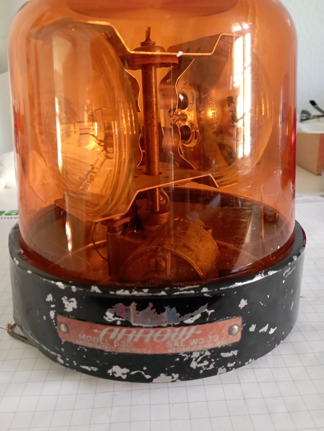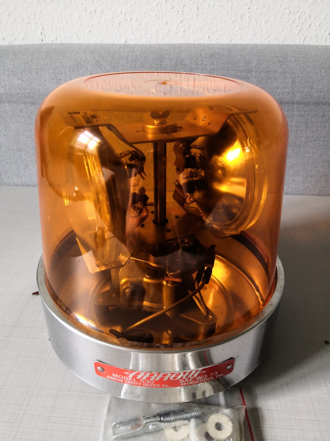 Hersteller: ARROW SAFETY DEVICE, Georgetown, Delaware Model: 550 Lampen: 2x sealed beam 7400 Volt: 12V Produktionsdatum: 17.04.1997 Die 550 ist quasi der Nachfolger der 530 und hat einen kleineren Motor. Ähnlich wie bei der 531 (4x sealed beam) und dessen Nachfolger 551. Die Leuchte selbst macht einen guten Eindruck. Bis auf die Haube vollständig, aber da ich noch einige Stratolite 77 habe, passt das wunderbar. Saubermachen, Dellen beseitigen, Schaft entrosten, Funktion testen, Typenschild aufbessern... Das übliche |
