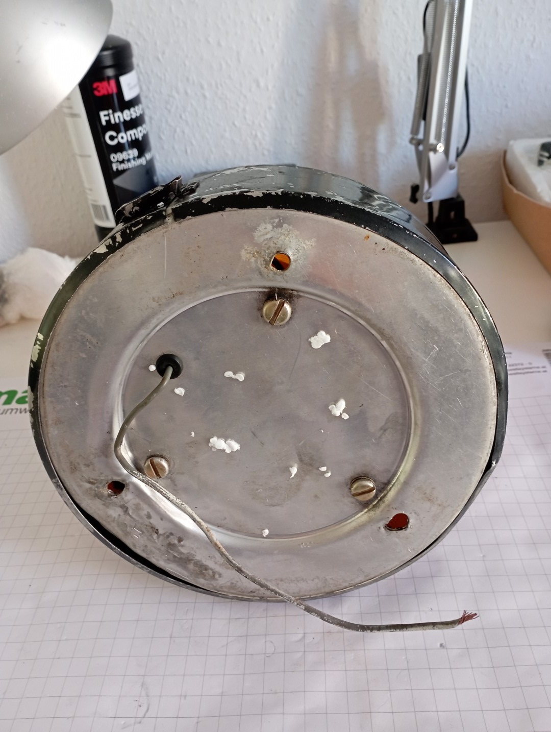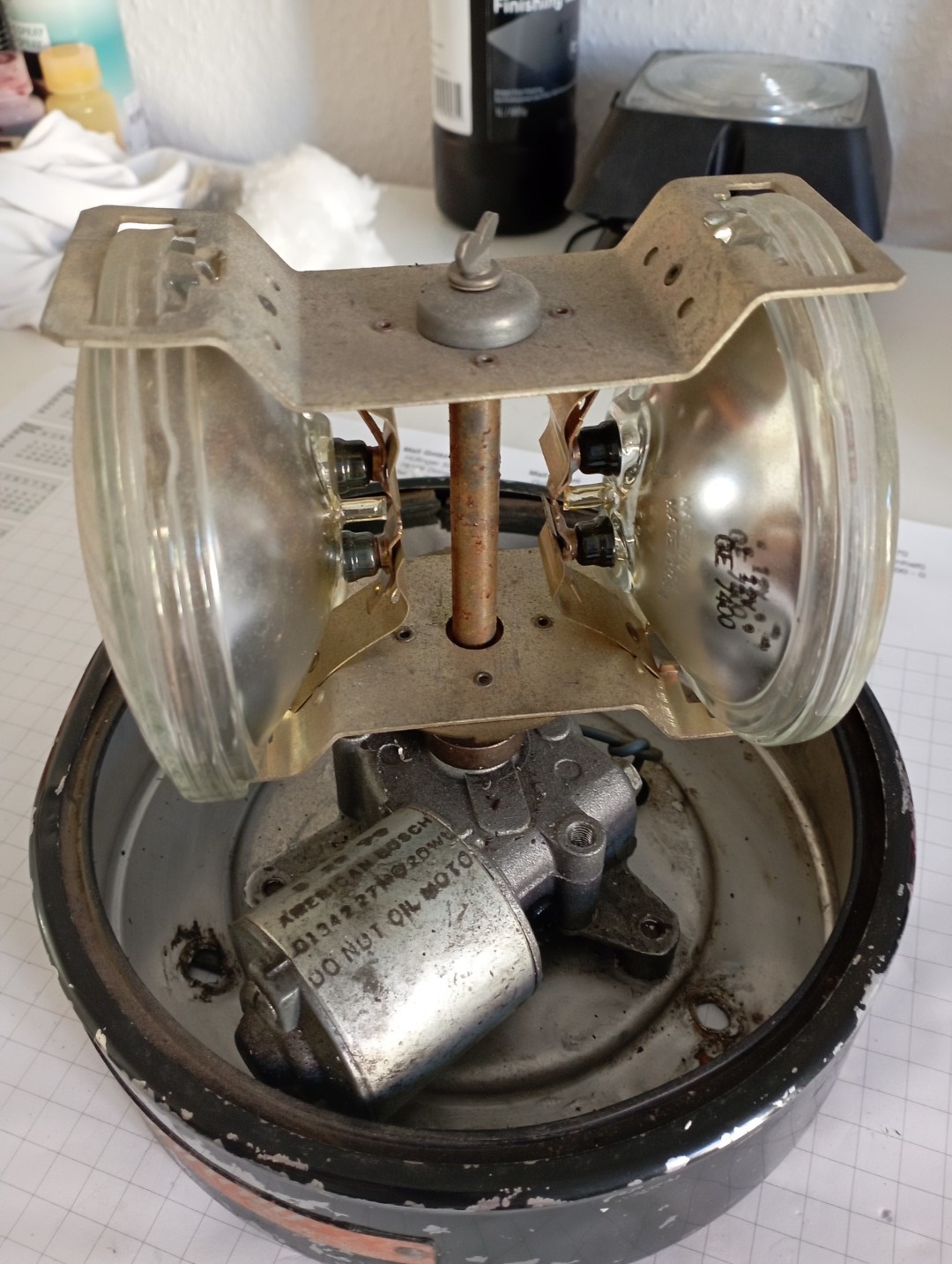 sealed beams: 2x 7400 Typ: 530 Volt: 12V Produktionsdatum: Mai 1990 Das Metallband ist sicherlich keine Schönheit und auch das Unterteil selbst hat einen heftigen Treffer bekommen. Aber das Teil funktioniert einwandfrei und ist immerhin auch schon 33 Jahre alt. Sauber gemacht, Metallteile poliert und den schwarzen Lack entfernt. Und eine neue Haube drauf -fertig. |