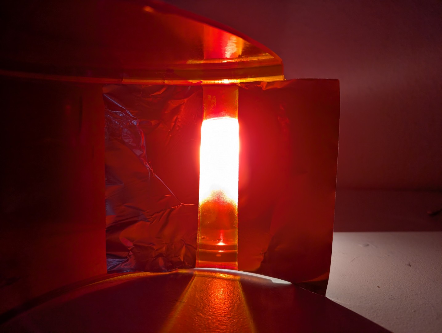 Es gibt ja zwei Möglichkeiten (mit allen Vor- und Nachteilen): zwei Hälften zusammenkleben oder einen amber dome hälftig in transparent rot lackieren. Mit folgenden Sachen habe ich den Versuch gestartet: Auto-K Nummer 33115 in 150ml ein arg gebrauchter model 14 dome, der allein vom hinschauen schon zerfallen ist. und so kam es auch... Das Abkleben diente nur zur Einschätzung der Farbkante. Im richtigen Einsatz muss natürlich alles abgeklebt werden was amber bleiben soll. Ich habe links nicht angeschliffen, rechts etwas angerauht mit 3000er NSP. Nach dem Lackieren von außen gesehen Innenseite, ein Kreppband bereits entfernt. Lackbild ist soweit gut. Aber dann zeigt sich das Dilemma. Auch wenn die Grundlage nicht mehr toll ist, zeigt sich das milchige Gesamtbild der lackierten Fläche. Hier mal zum Vergleich die werkseitige Lackierung bei einer GROTE 7622 Haube. |