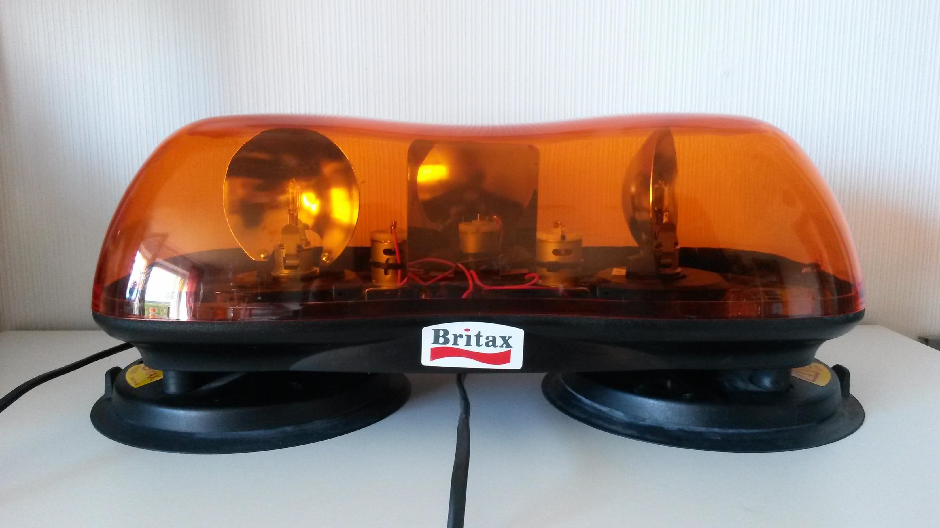 Es handelt sich dabei um einen Mini-Gelblichtbalken mit Magnetbefestigung. Die Betriebsspannung beträgt 12 Volt, die Stromversorgung wird durch ein etwa 2 Meter langes, glattes Kabel mit Zigarettenanzünder-/DIN-Stecker hergestellt. Der Balken ist 420 mm breit, ca. 185 mm hoch und etwa 200 mm tief. Zwei groß dimensionierte, vollgummierte Magneten halten den Mini-Lichtbalken auf geeigneten Untergründen (Stahldächern, pp.) in Position. Die Gummierung verhindert, dass die Magneten Schrammen im Lack hinterlassen. Weiter ist eine Dichtlippe aus dem Gummi geformt. Sie erhöht die Rutschfestigkeit. Die beiden Magneten halten den Aerolite lt. Herstellerangaben bis 80 mp/h, bzw. 112 km/h auf dem Fahrzeugdach. Ein entsprechender Warnhinweis ist auf den Magneten aufgeklebt. Zum lösen des Balkens sind an der Außenseite der Dichtlippe Griffe. Die Lichthaube ist mit zwei Schrauben am Gehäuse verschraubt. Weiter findet sich auf jeder Seite der Lichthaube das Typenschild des Mini-Lichtbalkens. Ein weiteres Typenschild ist innen aufgeklebt Im Inneren des Lichtbalkens drehen sich zwei Metalldrehspiegel um je eine feststehende H1-Glühlampe. Die Drehspiegel werden über einen Treibriemen von je einem Motor (Einbaulage: auf dem Kopf stehend) angetrieben. Jedes der beiden Lichtmodule (Drehspiegel, Glühlampe und Motor) ist auf einer Trägerplatte angebracht, die mittels vier Schrauben auf die Grundplatte des Lichtbalkens geschraubt ist. Zur Verstärkung der Warnwirkung ist zwischen den beiden Lichtmodulen ein Spiegel eingebaut, der im 45° Winkel zwischen den beiden Drehspiegeln steht. Zusammenfassend ist der Britax Aerolite 420 M ein durchaus brauchbarer Mini-Lichtbalken für alle, die keine Hochgeschwindigkeitsfahrten machen. Das Lichtsignal ist gut wahrnehmbar und durch den Spiegel für Deutschland auch untypisch. Der Antrieb ist angenehm leise. Die Verarbeitung ist robust und wirkt durchdacht. |