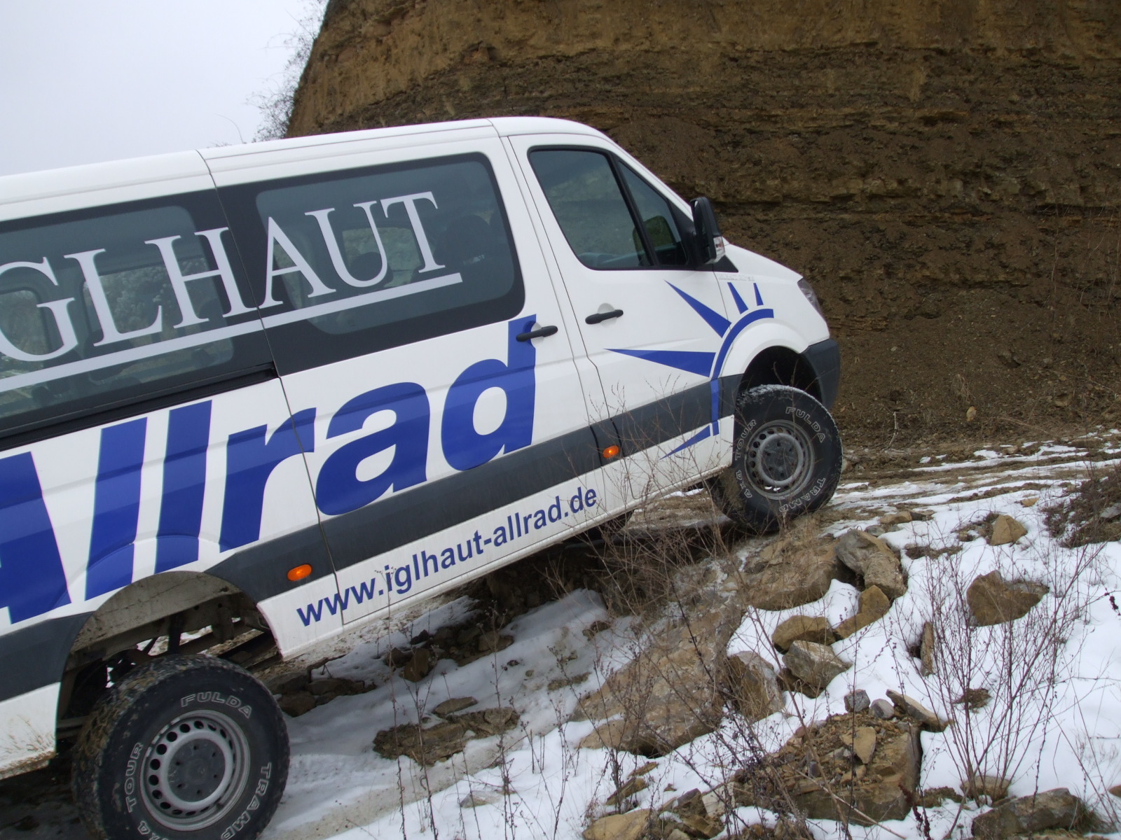 Ich habe mit dem Werksfahrer eine Tour im Gelände unternommen, der hat aus dem Wagen alles geholt. Für das Fahrzeug gab es im Steinbruch und am Hang im Feld keine Grenzen. Ich hatte schon lange Angstgefühle und Rückenschmerzen, da ist das Fahrzeug immer noch munter marschiert. Wir haben auch alles bestellt, Sperren hinten / vorne / zentral, Untersetzung, Unterfahrschutz, Unterbodenschutz, Frontbügel mit Zusatzscheinwerfern, Vorrüstung für Seilwinde, 200PS mit Automatikgetriebe, spezielle Schiebetür für Allradfahrzeuge (andere Ausstellung der Karosserie) usw. Und jetzt erfolgt gerade die Komplettlackierung in leuchtrot und der Innenausbau zum Sonder- RTW. Außerdem bekommt er noch ein geländegängiges Anhängersystem für Material usw. | |
