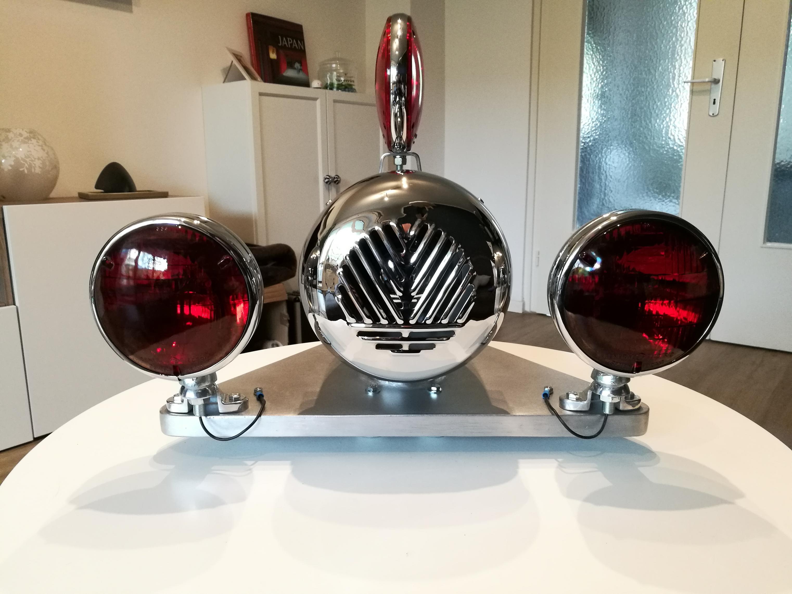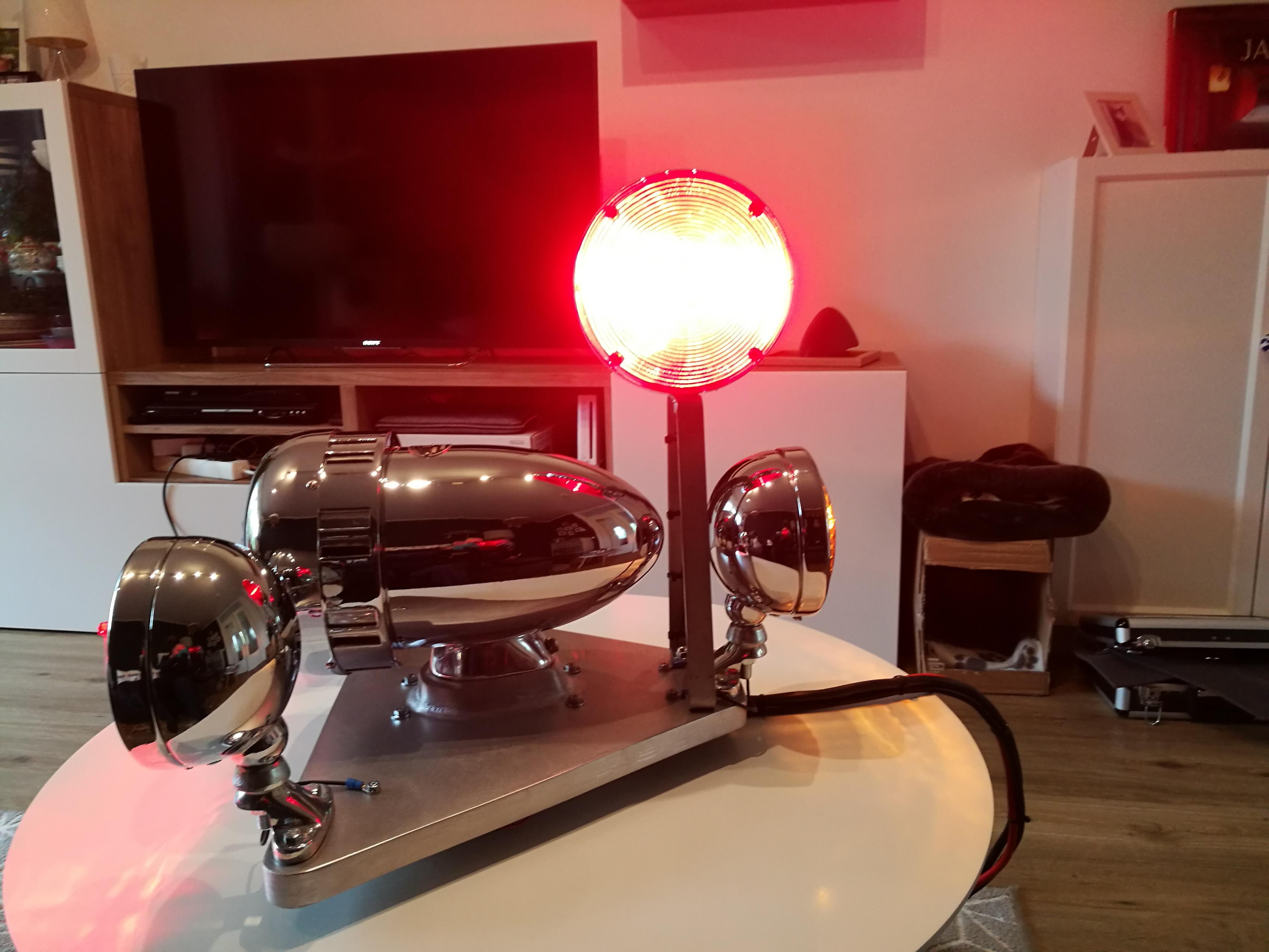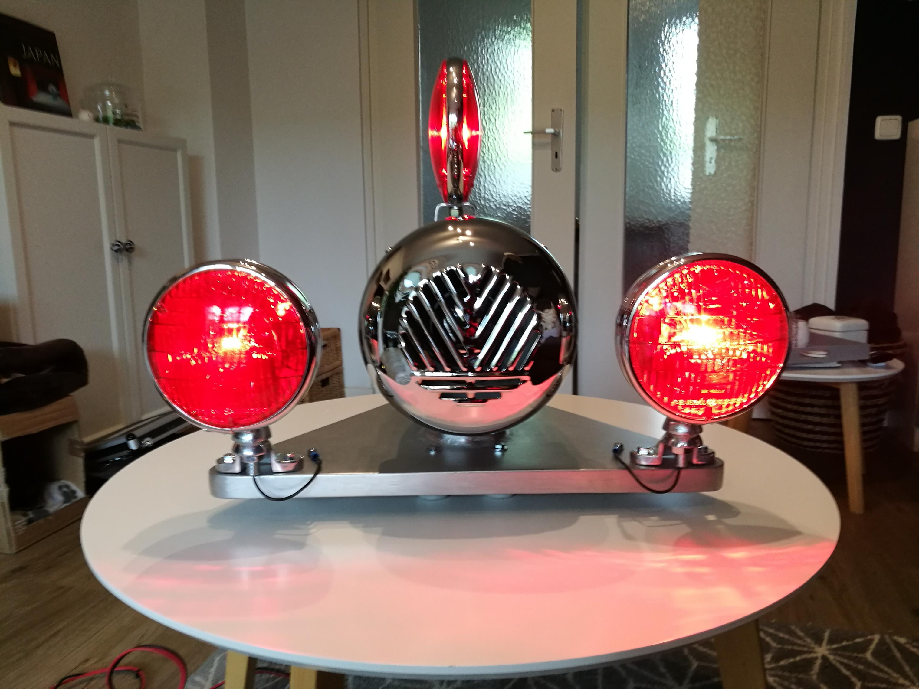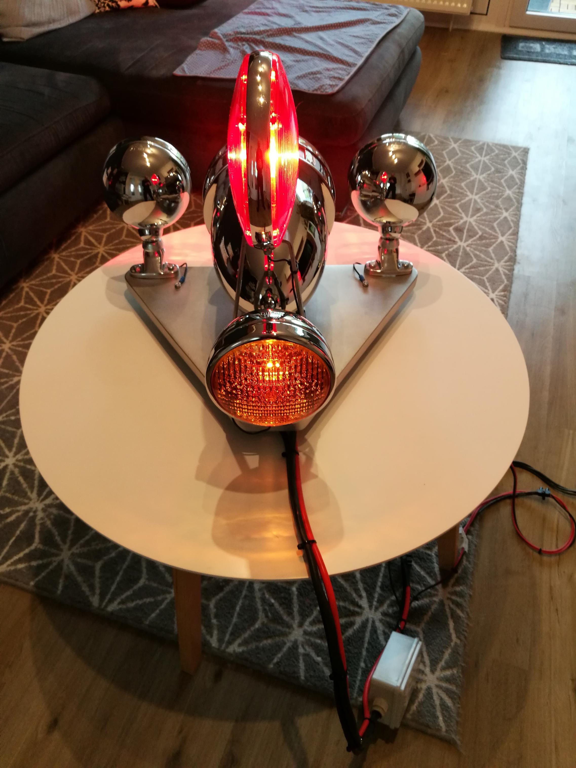 Zunächst hat die Grundplatte 4 Gummifüße bekommen. Normalerweise würde an der Stelle die Verbindung zum Fahrzeug stattfinden. Dann habe ich die Kabel verlegt. Alle Leuchten haben einen eigenen Pluspol, der isoliert durch die Platte geführt wird. Ich habe dann mal die Videos "ausgewertet" Die blinkende Frontleuchte und die Seitenleuchte blinken immer zusammen. Laufen also zusammen auf einen Flasher. Die Heckleuchte blinkt unabhängig von den beiden roten Leuchten. Bekommt somit auch einen eigenen Flasher und keinen Wechselblinker. Die Flasher saßen vermutlich im Fahrzeug. Ich habe beide in einen Anschlußkasten, in die Zuleitung, gesetzt. Das soll quasi den Anschlußkasten im Fahrzeuginneren darstellen. |