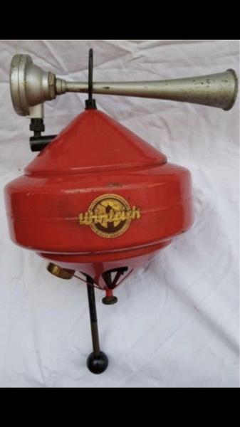 Denke es ist ein Vorkriegsmodell eines Hausfeueralarmes. Wird im innern ein Schwungrad in Gang gesetzt mit dem ein konstanter Luftstrom erzeugt wird, der die Martinfanfare eine ganze Zeit hupen lässt? Es grüsst freundlich Alex |