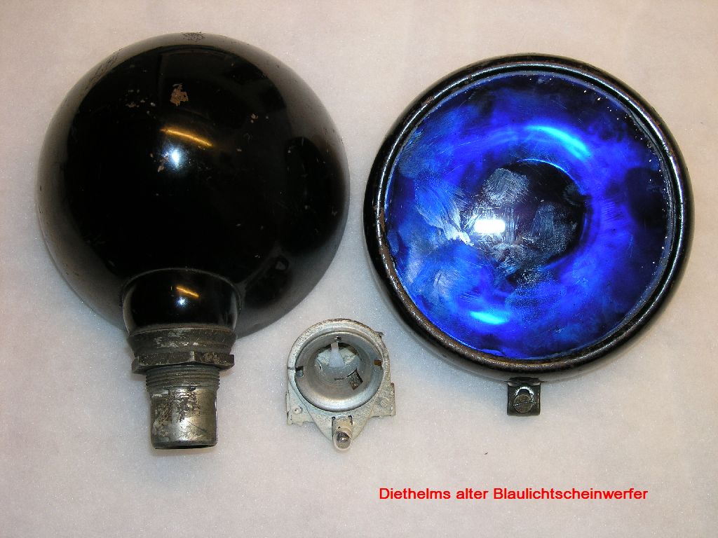 Diesen Blaulichtscheinwerfer (Baujahr unbekannt) möchte ich gerne wieder "epochegerecht" in Betrieb nehmen, weiß aber nicht, wie er ursprünglich montiert war und welcher Schalter und welche Kontroll-Leuchte seinerzeit üblich war. Das gilt auch für die unterschiedlichen Lichtschaltungen, die die drei Lampenwendel (bei Vollbestückung) theoretisch ermöglichen.