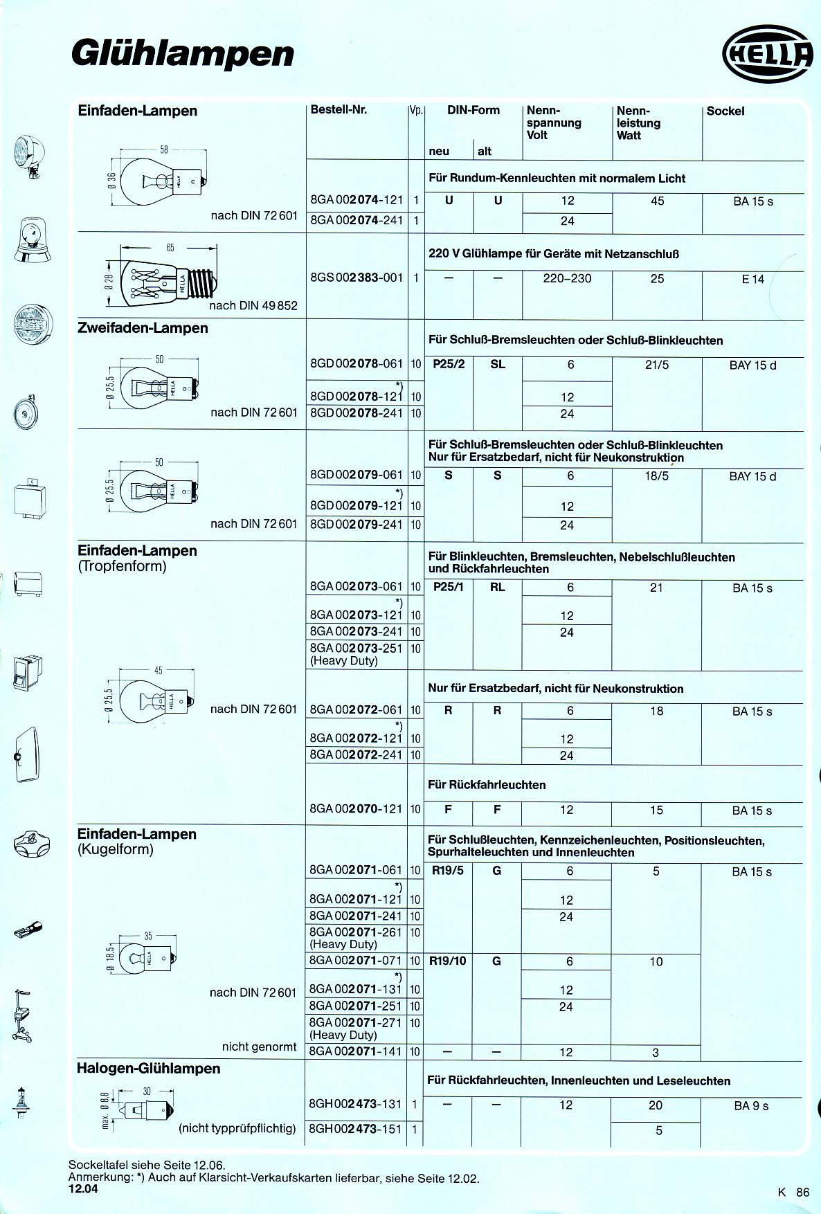 Ich glaube nicht, dass eine 45 W-Birne mit dem BA 15 s Sockel verbaut war. Denn die Fassung hat 2 Laschen für den + Pol. Ich habe es ausprobiert. Wenn man eine Birne mit BA 15 s Sockel verbaut, muss man die + Pol Laschen der Fassung verbiegen, um Kontakt zu erhalten. Es gehört demnach eher eine Birne mit dem BA 20 d Sockel verbaut. Die gibt es als Einfaden-Birne aber nur mit 35 Watt, in der 12 Volt-Version. Für medizinische Lampen wurden aber auch stärkere Birnen mit besagtem Sockel produziert. Was gehört denn in die 12 Volt Eisemann Feuerwehr Arbeitsscheinwerfer ? In der 24 Volt Version gehört eine 100 Watt starke Glühbirne Dazu schweigt sich der Hella Katalog aus, obwohl Hella auch einmal solche Arbeitsscheinwerfer produziert hat (Für die Ästheten: Ich weiss,der Fachmann spricht von Glühlampe und nicht von der Glühbirne) Aus dem Hella Hauptkatalog 1986: |