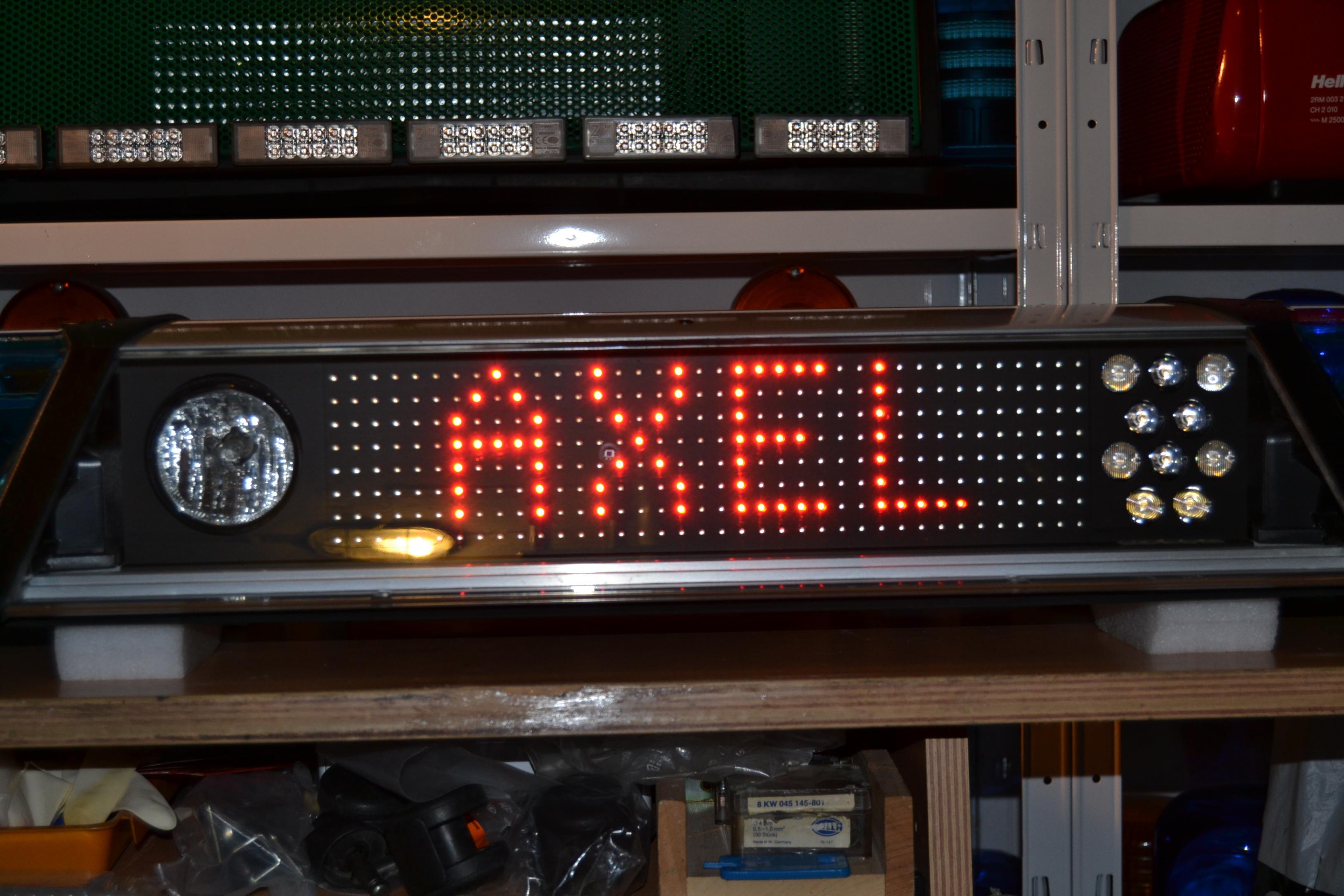 Vollmatrix vorn und hinten mit frei programmierbaren Schriften und allen interessanten festprogrammierten Texten (div. Polizei / Feuerwehr / Notarzt / Flughafen usw.).
