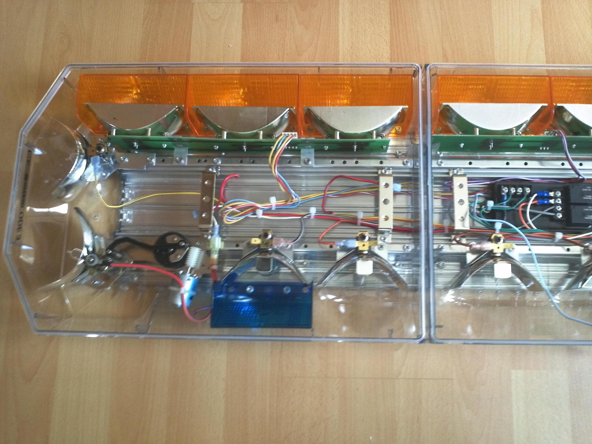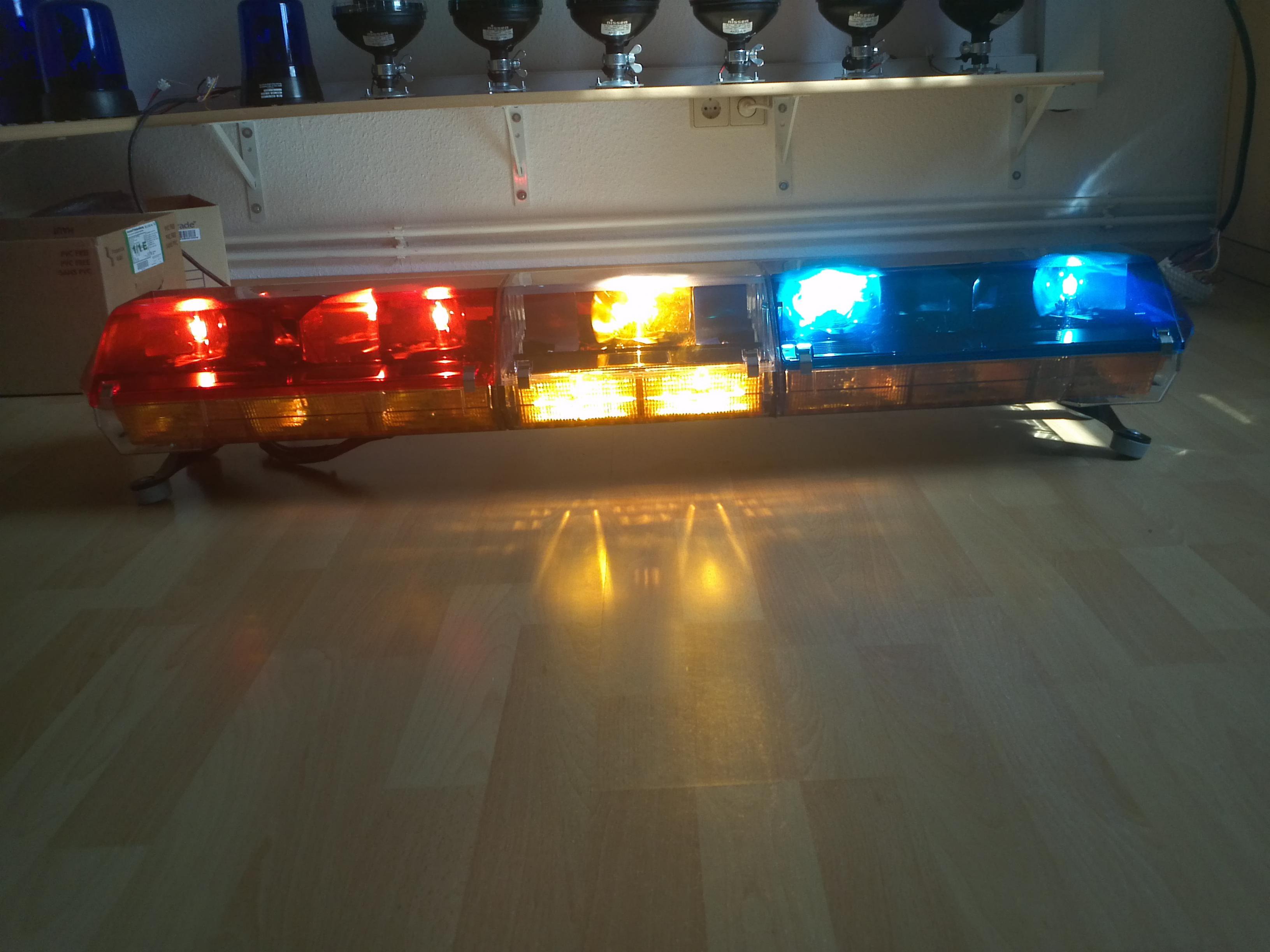 Ein Code 3 MX 7000 nach Vorbild des LAPD. Alle schwarzen Metallteile sind gesandstrahlt und neu Pulverbeschichtet worden. Alle Spiegel bzw. glänzende Sachen sind poliert. Die Upper Deck Domes sind im Nassschleifverfahren aufgearbeitet worden inkl. Polierung. Die Lower Deck Domes sind neu. Im Mittelteil sind die beiden rot/blau Filter eine Selbstanfertigung. Beim LAPD ist es ja normal das die beiden rot/blauen Flasher im Lower Deck als Steady Burn genutzt werden. Ich habe die mit einem Flasher versehen der jetzt zwei verschiedene Blinkmuster sowie die Steady Burn Funktion hat. Verbaut wurde ein 710er Code 3 Flasher. Hier nun die Bilder: |