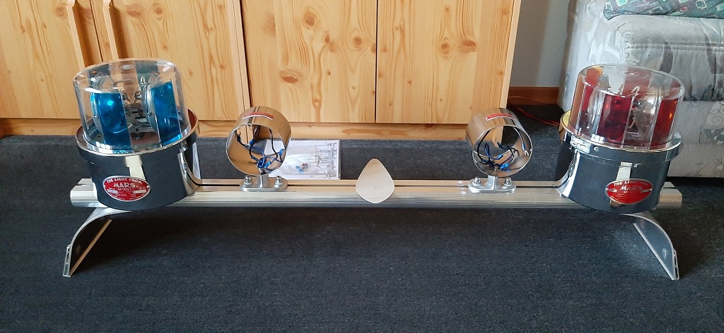 Ist zwar mehr Einzelleuchte als Balken, aber ich konnte dennoch nicht wiederstehen. Ist leider keine echte Skybolt Combo (stünde sonst auf den Typenschildern), sondern eine aus guten Einzelkomponenten zusammengestellte. (irgendwas ist ja immer) Zu erkennen ist das an den unterschiedlichen Typenschildern der beiden Skybolt. Zudem unterscheiden sich die Innenleben etwas. (ist noch der Ur-Zustand) Maße Grundträger (in etwa):
