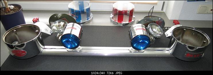 Ist nicht sonderlich dreckig und die Teile machen optisch noch einen durchaus guten Eindruck. Technisch gibt es aber ein paar kleinere Probleme: Auf der einen Seite dreht sich der Lampenhalter nicht mit und auf der anderen hatte die Kohlebürste leicht Kontaktprobleme. Das sollte sich aber recht einfach beheben lassen. Neben den klaren Hauben waren auch 12 rote sowie 6 blaue Farbfilter mit dabei. Die farblichen Gestaltungsmöglichkeiten sind also nicht allzu sehr eingeschränkt. Was bisher geschah: Aufgrund des vorhanden seins von blauen Farbfiltern, drängte sich hier die Farbkombination rot/blau quasi auf. (Außerdem hatte ich für die restlichen roten Farbfilter schon eine anderweitige Verwendung )Zur Erweiterung der "nackten" Lichtbrücke sind mir noch zwei doppelseitige Leuchten (Can Lights) in die Hände gefallen.