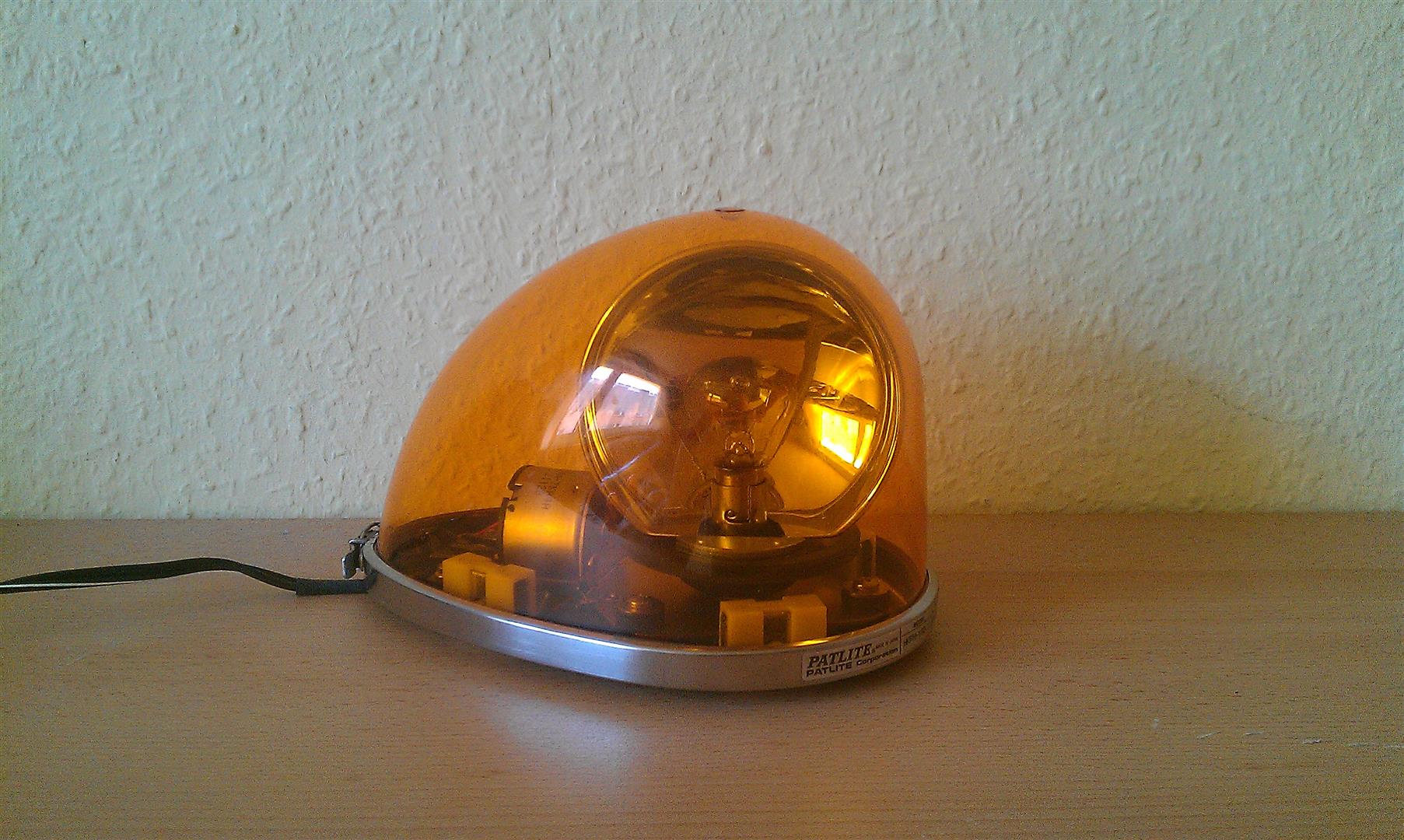 Der langsamdrehende (24 Volt Modell, ca. 80 Umdrehung/Minute) Flächenreflektor sorgt für ein gut sichtbares Lichtbild. Als Leuchtmittel dient eine Art H3 Leuchtmittel mit BAst15 Sockel Halogenlampe (leider ist hier noch das falsche Leuchtmittel verbaut). Diese Leuchte wurde hauptsächlich für den japanischen Markt konzipiert. Viele japanische Einsatzfahrzeuge sind mit Kennleuchten, Lichtbalken und Sirenen von Patlite ausgerüstet. Sehr oft in Zivilfahrzeugen der Polizei, wo sie aus dem Dach geklappt werden kann (dann allerdings in rot). Aufgrund der Verarbeitung und der Helligkeit ist das auch völlig in Ordnung.