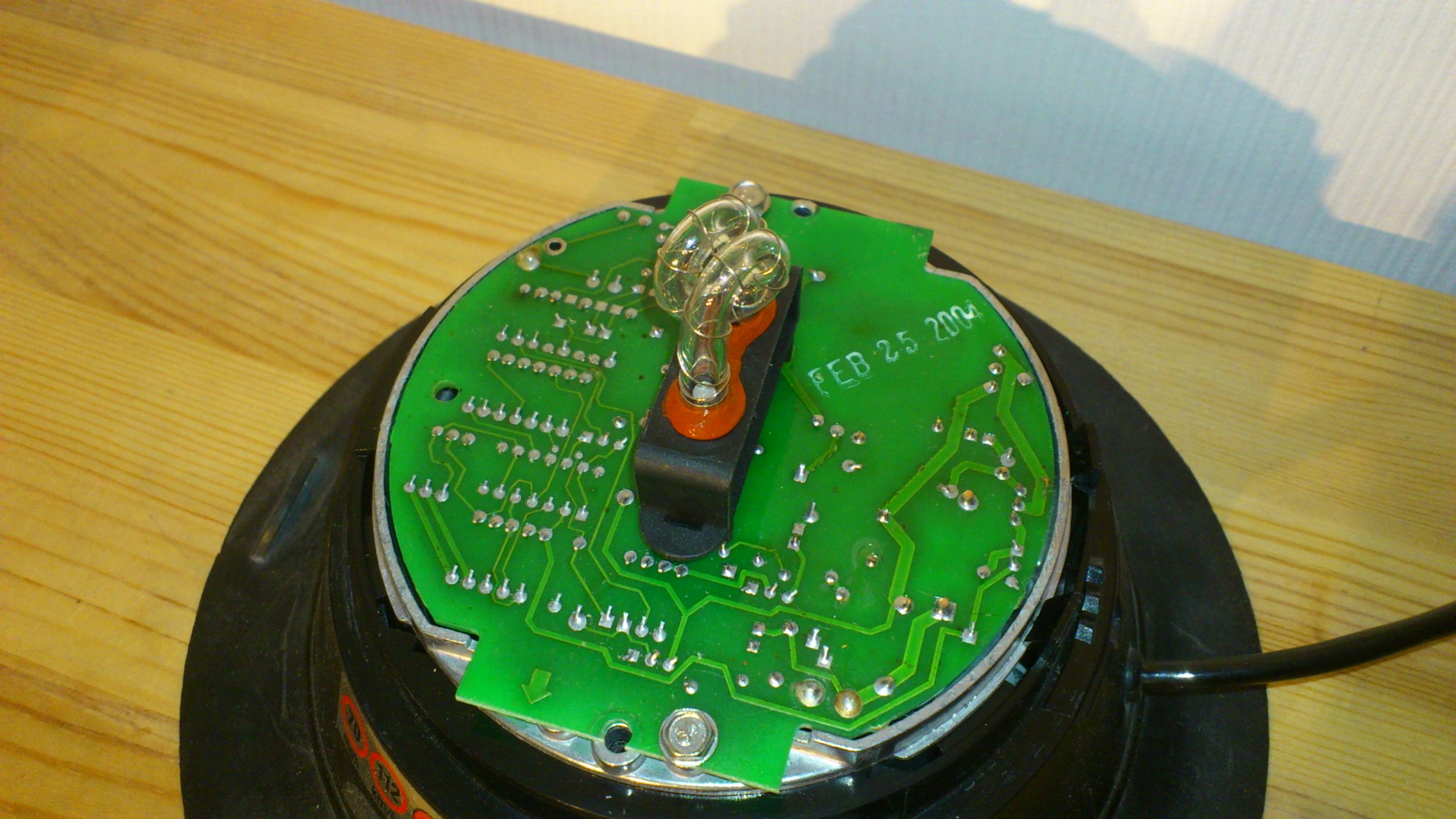 Nach dem Entfernen der Lichthaube ist die Oberseite der Platine und die gesteckte Blitzröhre sichtbar.