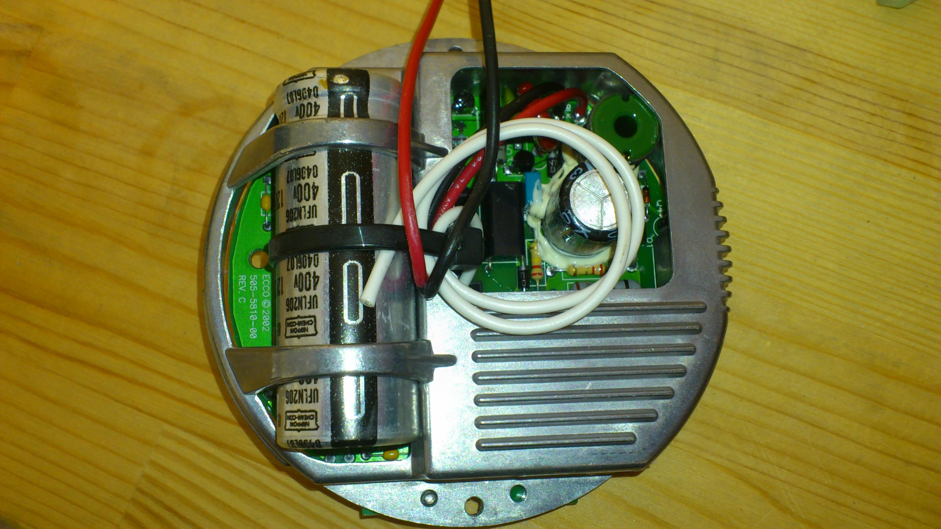 Um in eine Blick in die Leuchte zu werfen muss der Magnet-Sauger vom Gehäuse abgebaut werden. Dazu löst man die drei Schrauben an der Außenseite der Leuchte.