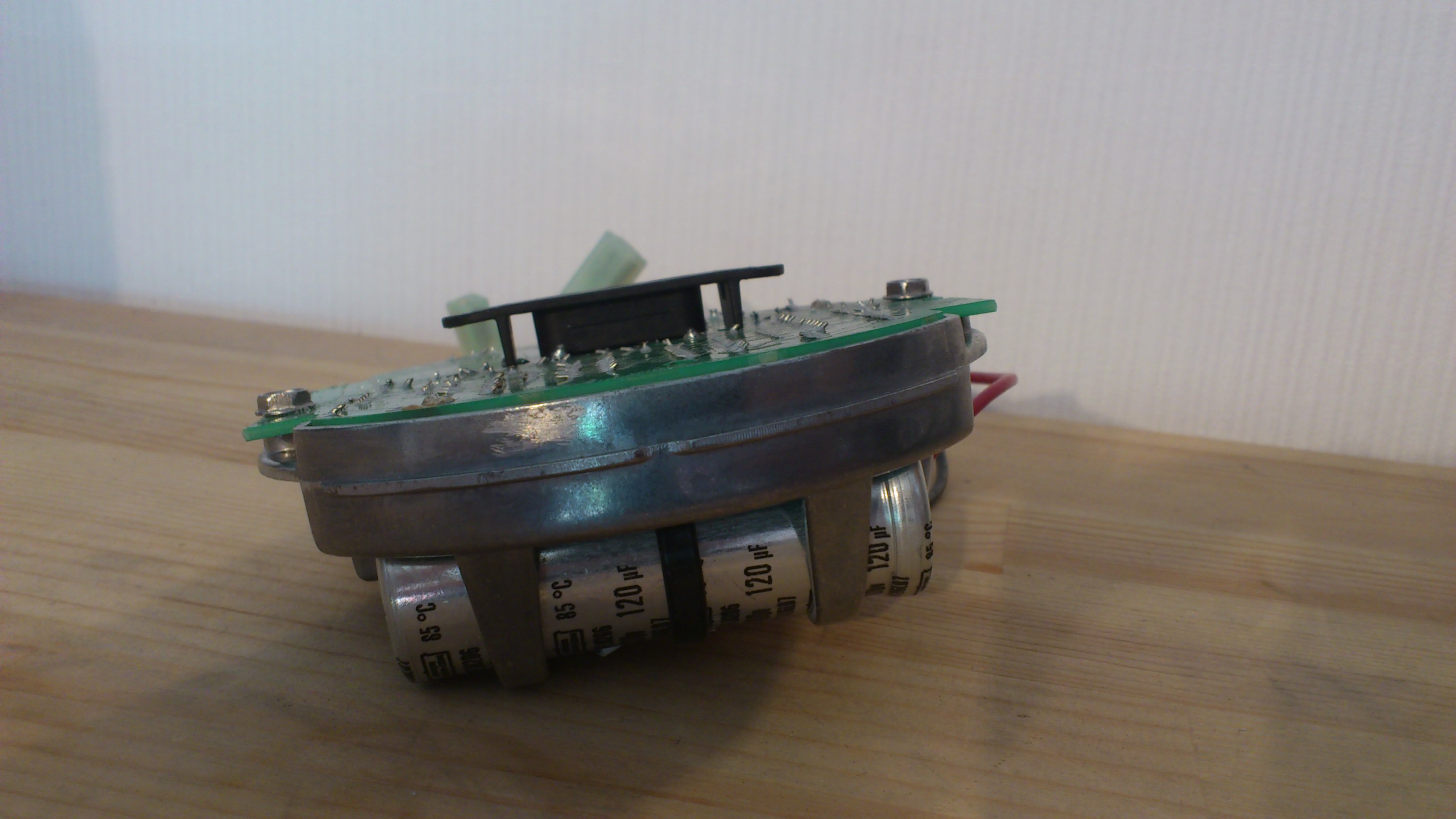 Blick von der Seite auf das ausgebaute Alu-Gehäuse mit Platine und Elko.