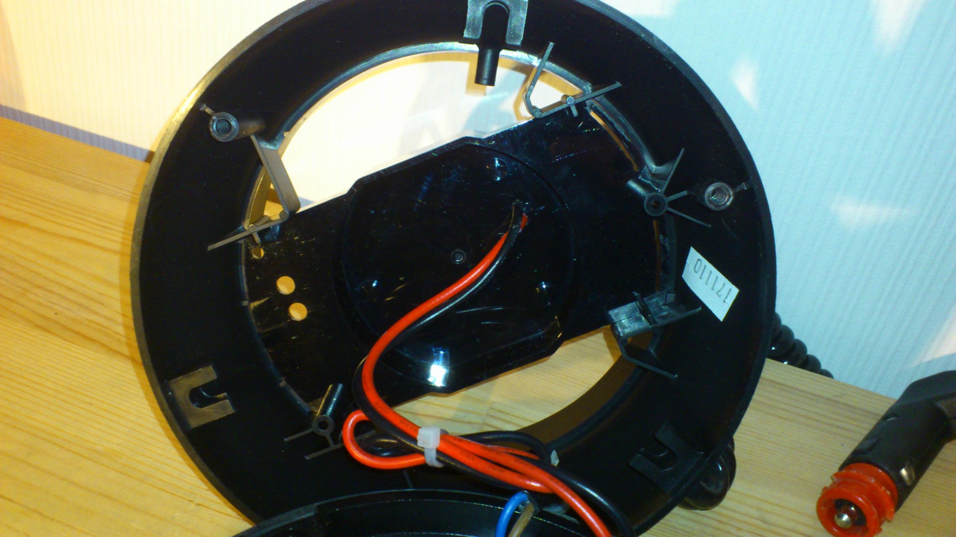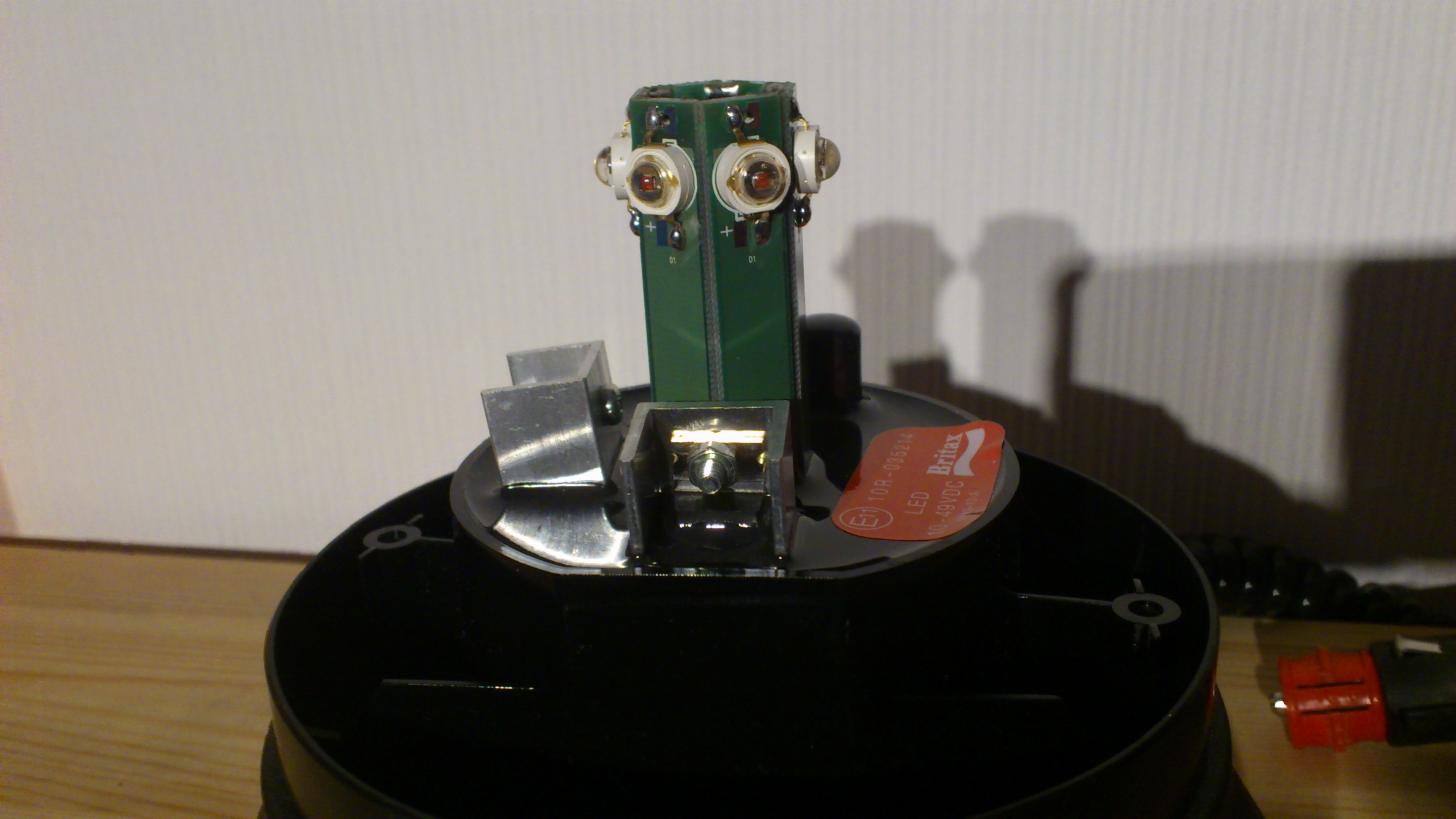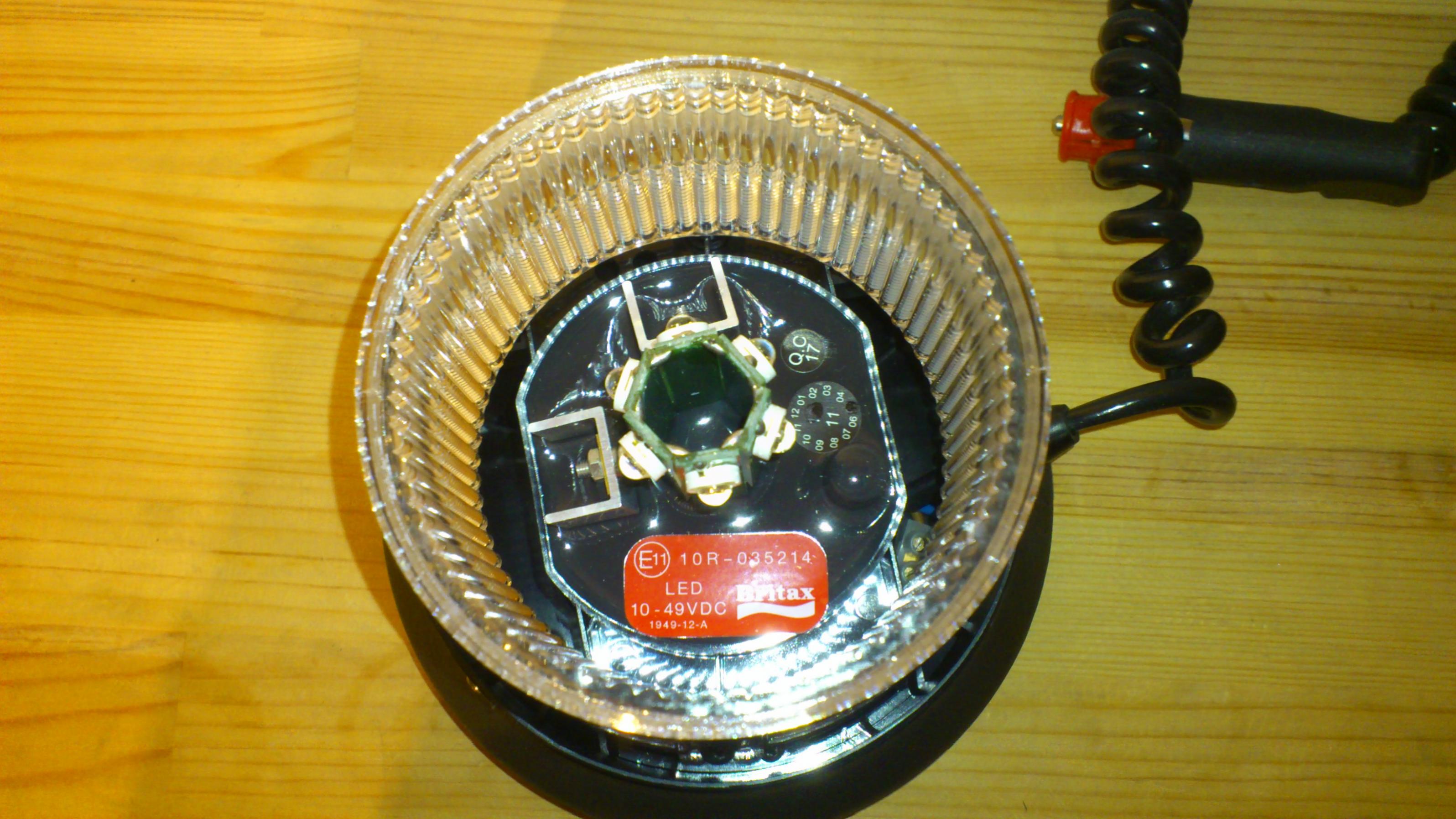 Über ein Spiralkabel mit Universalstecker wird die Leuchte mit Strom versorgt. Ein Magnetsauger hält die Leuchte auf geeigneten Untergründen. Unter der Lichthaube ist eine Fresnellinse erkennbar. Oben auf der Lichthaube ist der Britax-Schriftzug und die Materialbezeichnung der Haube (PC) erkennbar. Die Lichthaube ist ohne Optik. Die Fresnelllinse ist mit dem Leuchtengehäuse verschraubt. Die im Bild erkennbare Schraube dürfte als Haubenverriegelung konstruiert worden sein, jedoch ist sie bei dieser Leuchte wirkungslos. Von oben ist in der Fresnellinse ist der Turm mit den LED erkennbar. Zudem ein roter Aufkleber, auf dem u.a. eine E-Kennzeichnung der Funkentstörung ("E11 [im Kreis] 10R-035214"), die Betriebsspannung (10-49 Volt) zu sehen sind. Die schwarzen Aufkleber weisen zum einen (vermutlich) auf das Herstellungsdatum der Leuchte (5/10 also Mai 2010) und zum anderen auf eine erfolgreich bestandene Qualitätskontrolle hin. Insgesamt ist der Turm mit 6 LED unter je einer klaren Linse bestückt. Löst man das Leuchtengehäuse vom Unterteil mit dem Magnet-Sauger. so erkennt man eine Lüsterklemme. Sie verbindet das leuchteninnere Kabel mit dem Spiralkabel. Als Zugentlastung am Spiralkabel dienst ein weißer Kabelbinder. Ein quadratischer Gummi dichtet die beiden Teile gegeneinander ab. Weiter erkennt man von unten den vergossenen Block, in dem die Elektronik zur Signalerzeugung verborgen ist. Das Blitzsignal ist ein Dreifachblitz. Durch die Fresnelllinse wird das Licht der LED soweit gebrochen, dass annähernd die gesamte Lichthaube erleuchtet wird. Allerdings ist die Lichtleistung zu schwach, um bei Tageslicht ein gut wahrnehmbares Signal zu erzeugen. Fazit: Formschöne und sauber aufgebaute Leuchte für Anwendungen außerhalb des Straßenverkehrs. Mit etwas mehr "Punch" kann ich mir diese LED-Leuchte als brauchbare ECE-R65-Kennleuchte vorstellen. Kurzes Video: |
