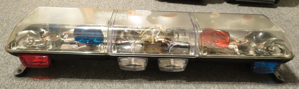 Aufgrund von reichlich verwendeter Luftpolsterfolie hat der Balken den Versand schadlos überstanden. Der Gesamtzustand ist durchaus noch als gut zu bezeichnen. Daher gibt es momentan keinen akuten Handlungsbedarf. Natürlich hat der Balken die ein oder andere kleine Macke und auch eine Grundreinigung würde nicht schaden (deshalb gibts auch noch keine Innenaufnahmen ). Aber eben nicht sofort.Da mir die Ausstattung/Farbgestaltung so recht gut gefällt wie sie ist, wird es keine großen Änderungen geben. Allerdings konnte ich nicht wiederstehen die bestehende Ausstattung noch durch Intersection Lights zu ergänzen. Technik/Aufbau: Der StreetHawk hat einen dreit teiligen Grundträger aus C-Profilen. Durch diese Teileung kann der Grundträger auf die verschiedenen Längen (35" und 48") eingestellt werden. Die Hauben sind mit den unteren Gehäuseteilen verschraubt. Die Leuchten der unteren "Ebene" werden direkt in den unteren Gehäusehälften befestigt, wohingegen die Drehspiegel teilweise (durch die Gehäusehälften hindurch) auch mit dem Grundträger verschraubt sind. Der Antrieb der Drehspiegel erfolgt über Schneckengetriebe. |