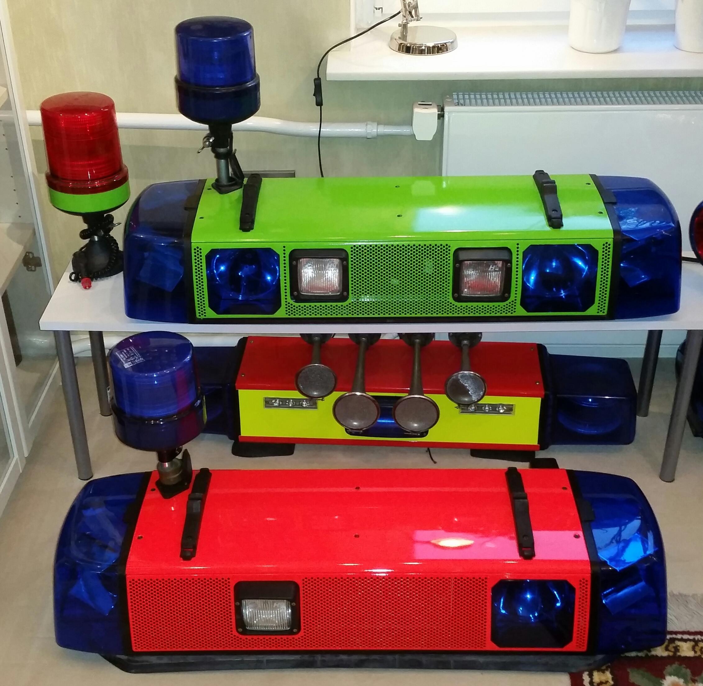 Kompletter Eigenbau, 10 LIN6 LED Module (8× Blau, 2× Amber), 4 LIN12 Eckmodule in Blau, ein altes gekürztes Edge LFL Profil, alte aufpolierte Hauben, ein ShoMe LED Flasher und 2 Dosen schwarzer Sprühlack später...