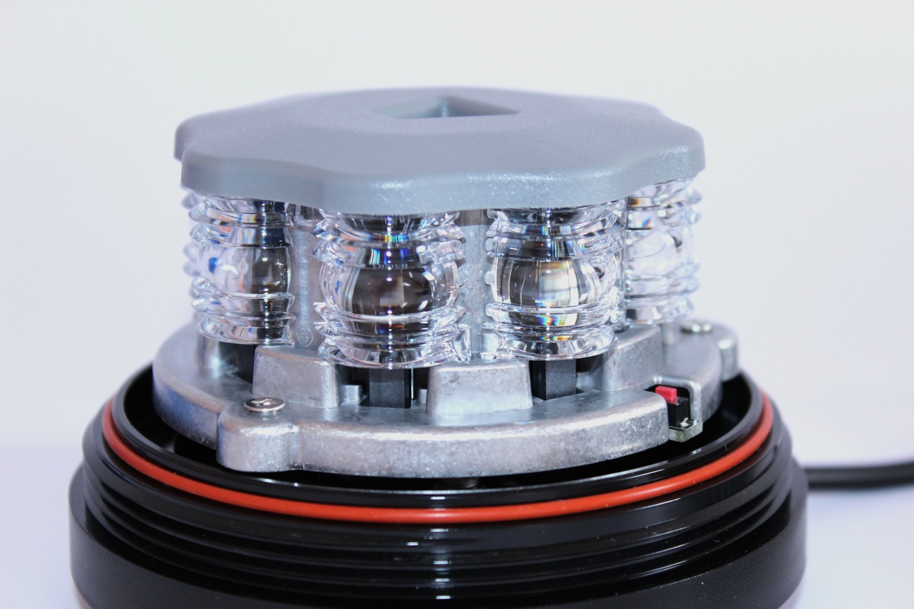 Die Lichthaube kann mittels Schraubgewinde recht einfach von der Kennleuchte abmontiert werden. Zwecks Dichtung sitzt oberhalb des Gewindes innen eine Gummidichtung. Wenn die Lichthaube wieder fest auf den Sockel geschraubt wird, sollte dann die Leuchte recht gut gegen das Eindringen von Regenwasser geschützt sein.