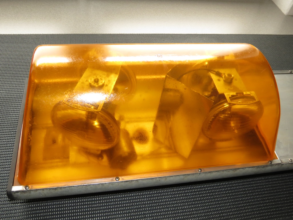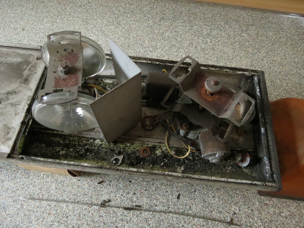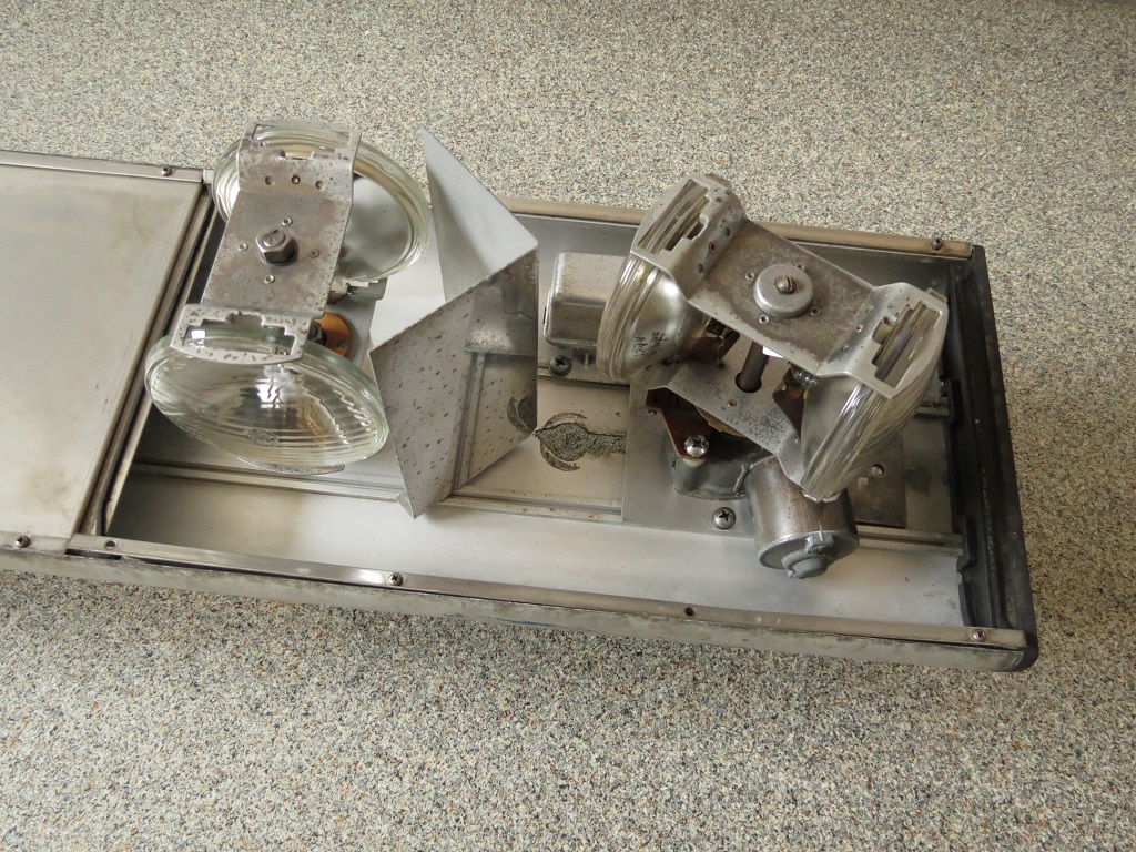 Eine erste Bestandsaufnahmen ergab: 5 PAR36 Leuchtmittel gut, 1 weiteres gut aber falsch und eines defekt. Beide Motoren drehen und beim Flasher tut sich auch was (man hört ihn schalten). Die Befestigungsleisten der Hauben ließen sich gut entfernen und bei den Drehern + Spiegel musste nur bei einer Schraube der Kopf runter gebohrt werden. |