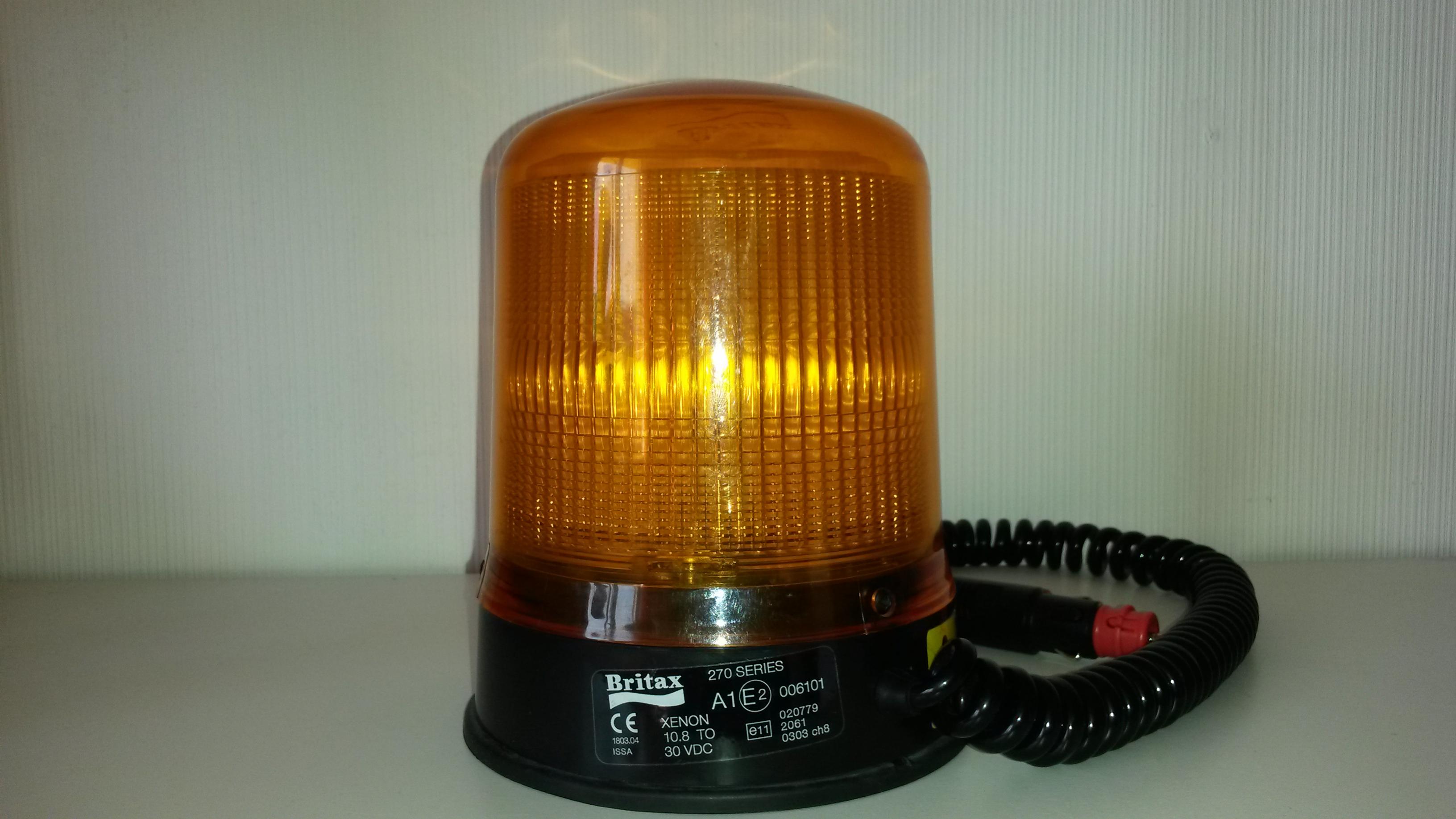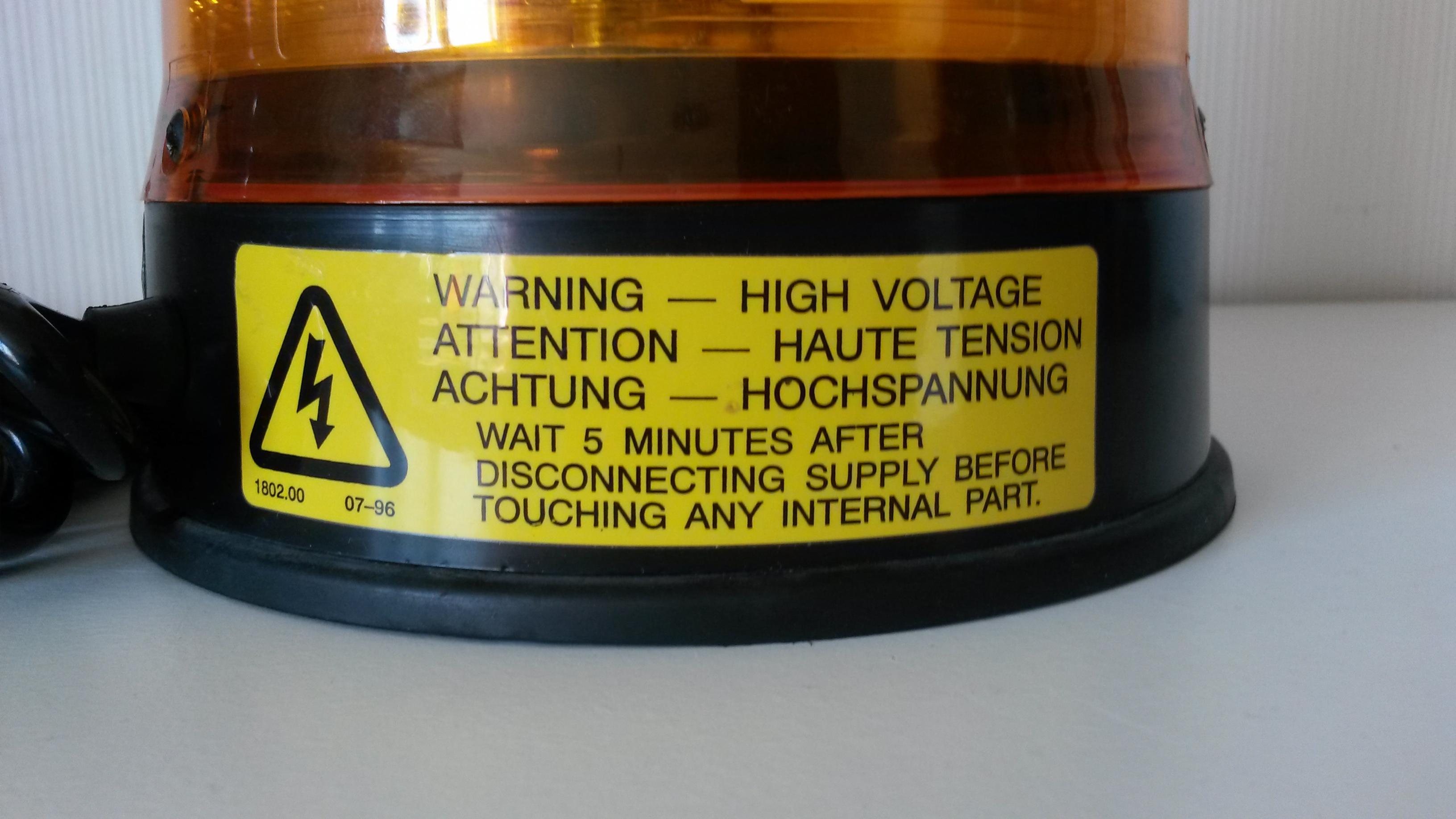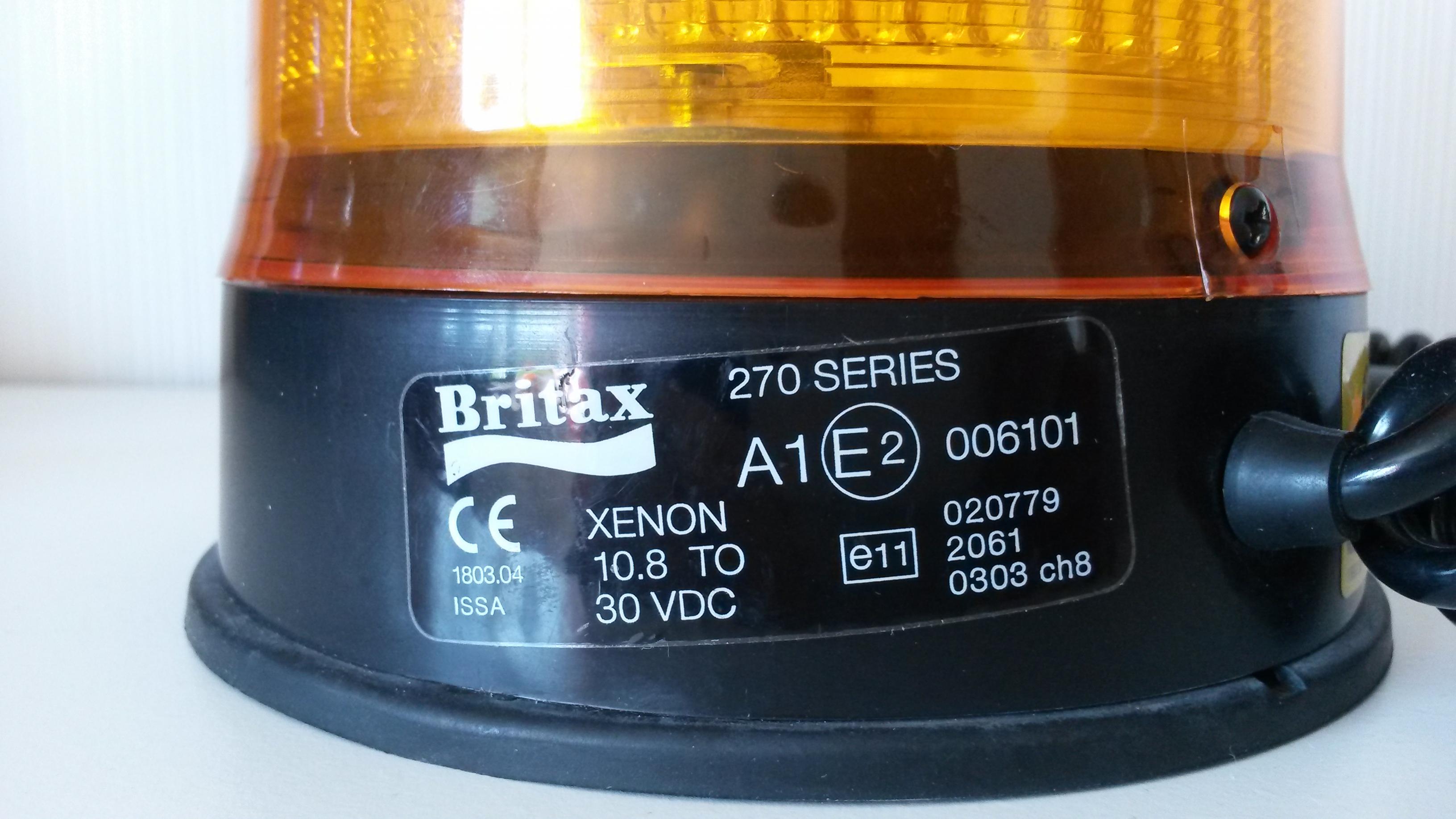 Eine Britax 274 Series in gelb-orange. Die Leuchte wurde von einem Fuhrunternehmer angeschafft, um sein Fahrzeug auf einer Autobahnbaustelle mit Gelblicht kennzeichnen zu können. Da der originale Britax-Stecker beschädigt war, musste ich ihn durch einen universalen DIN- / Kfz-Stecker ersetzen. Die Leuchte ist mulitvoltagefähig und arbeitet in einem Spannungsbereich von 10,8 bis 30 Volt "ohne die Notwendigkeit von Einstellungen" (O-Ton Bedienungsanleitung). Auf dem Gehäuse sind die Typenschilder und Warnhinweise teilweise schief aufgeklebt. Die Lichthaube ist klar, oben ist der Britax-Schriftzug vorhanden und es ist ein erster Blick auf die Stabblitzröhre möglich. Die Stabblitzröhre wirkt sehr klein, schafft es aber durch die gute Fresnell, die Lichthaube großflächig auszuleuchten. Die Fresnelllinse ist außen glatt und mit dem Gehäuse und der Platine verschraubt. Von oben ist die Verschraubung erkennbar. Vier Schrauben mit klaren, T-förmigen Unterlegscheiben halten die Fresnelllinse auf der Platine. Blick auf die demontierte Fresenlllinse und die Schrauben. Nach dem herausnehmen der Platine kann man auf die Innenseite des Magneten (mit Kunststoff überzogen). Blick auf die Unterseite der Platine. Die Aufkleber lassen vermuten, dass die Platine am 12.02.2010 gefertigt wurde. Die Doppelblitzleuchte erzeugt ein gut wahrnehmbares Signal und ist für den Fahrbetrieb bis 64 km/h zugelassen. Lt. der Montage- und Bediensungsanleitung wurde die 274 Series im Windkanal bei 193 km/h getestet, aus Sicherheitsgründen wurde sie jedoch nur ein Drittel der getesteten Geschwindigkeit freigegeben. |