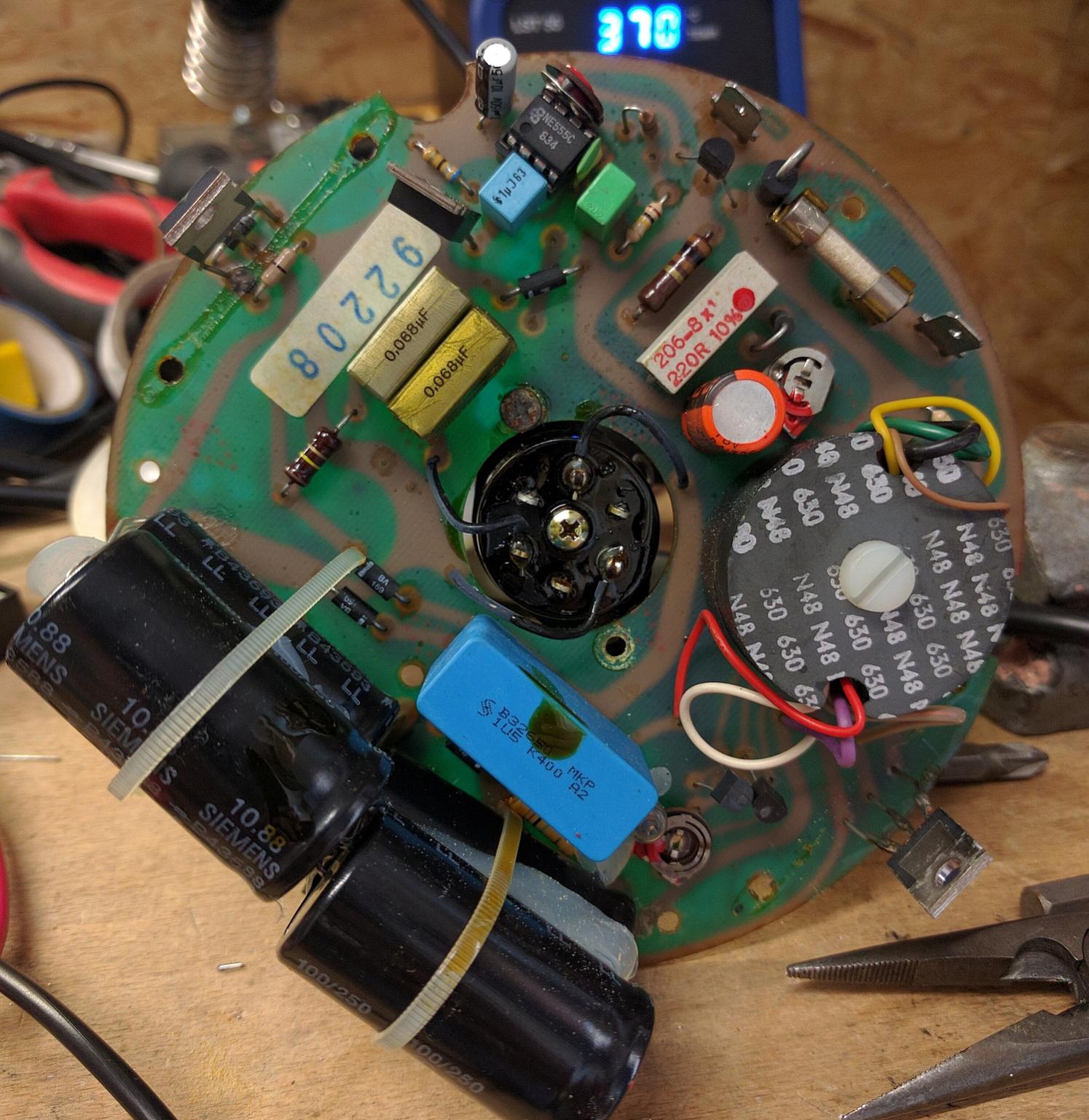 (Die Hilfselektrode ist das linke Kabel am Röhrensockel) Die zwei Metallpapierkondensatoren sehen nicht mehr allzu gut aus (Risse im Gehäuse), der SCR sollte noch funktionieren. Hat von euch jemand eine Idee?