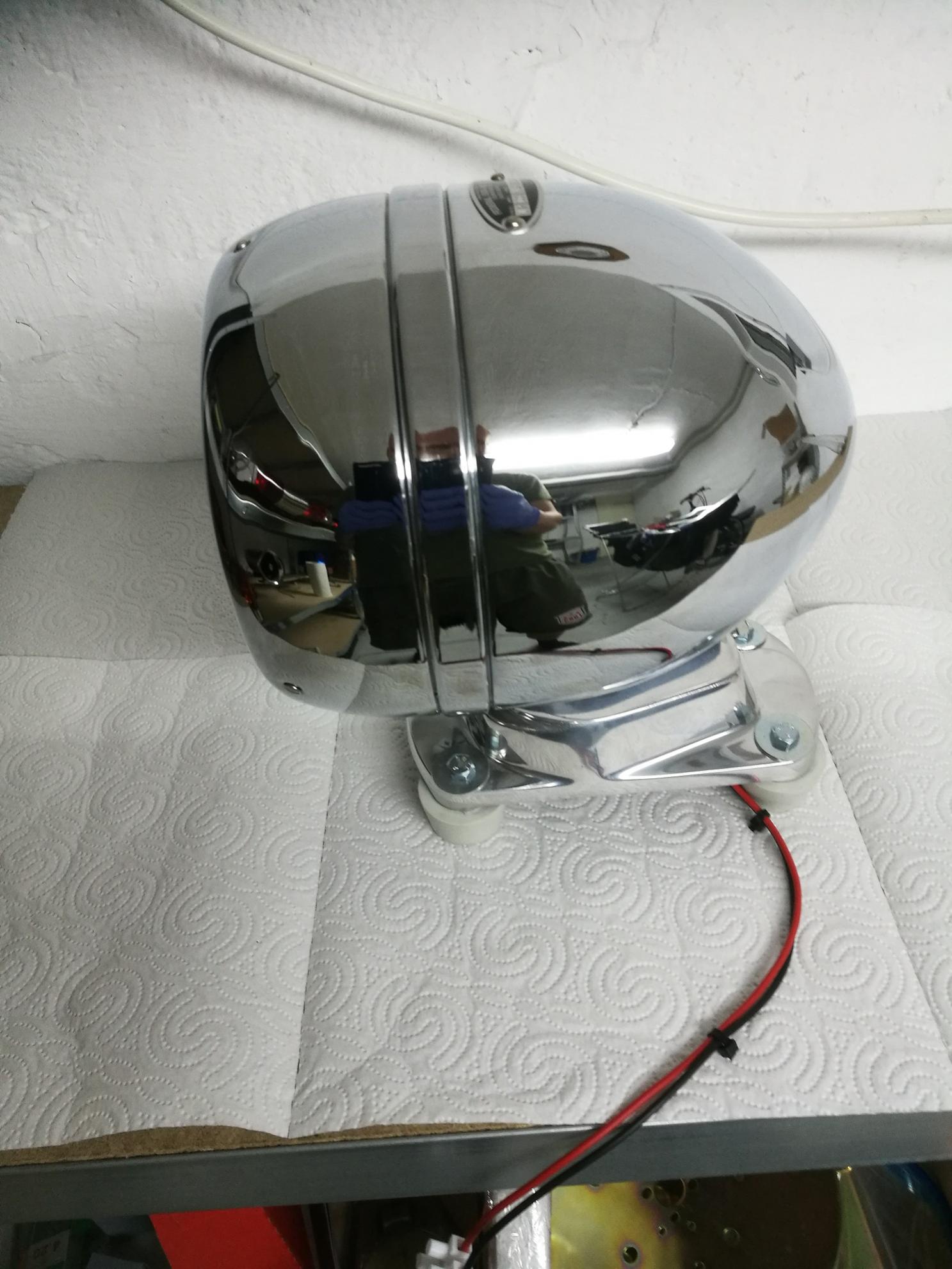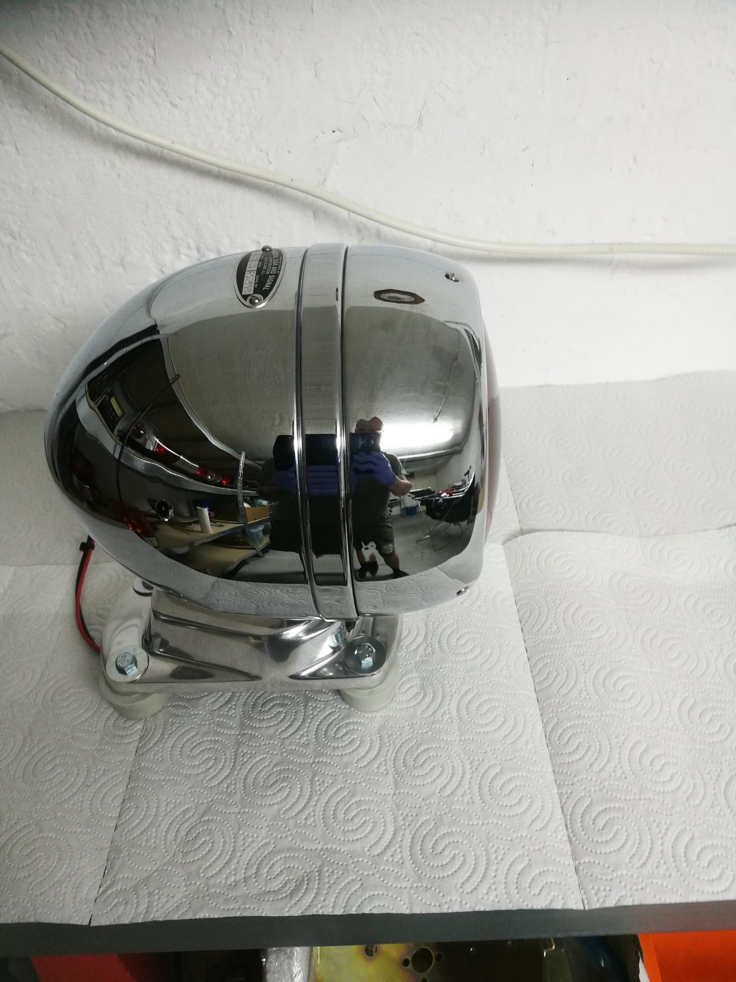 Eine sehr alte Federal Signal Model 19 Das Besondere ist, dass diese Leuchte nach vorne gerichtet ist, sich aber trotzdem im Kreis dreht. Somit wird durch einen Spiegel ein Rotationseffekt erzeugt. Wie üblich, alles neu verchromt, verzinkt und poliert. Als erstes wurde das alte Zahnrad durch ein neues aus Messing ersetzt, dadurch wesentlich bessere Haltbarkeit. Bei den alten Zahnrädern brachen immer Zähne ab. Der Motor war eine große Herausforderung. Im Original war der nicht lackiert, aber mir blieb keine andere Wahl. Das Gehäuse war extrem verrostet. Es waren tiefe Krater drin. Alles wurde gespachtelt und lackiert. Das komplette Innenleben wurde ebenfalls restauriert. Alle Kabel sind mit Schrumpfschläuchen überzogen worden. Alle nicht-leitenden Platten sind erneuert worden. Innen, am Gehäuse, wurde Rostumwandler angewandt und danach mit einer Sprüh-Zink-Schicht gearbeitet. Danach wurde alles zusammengesetzt. Hier nun die Bildergalerie dazu: |
