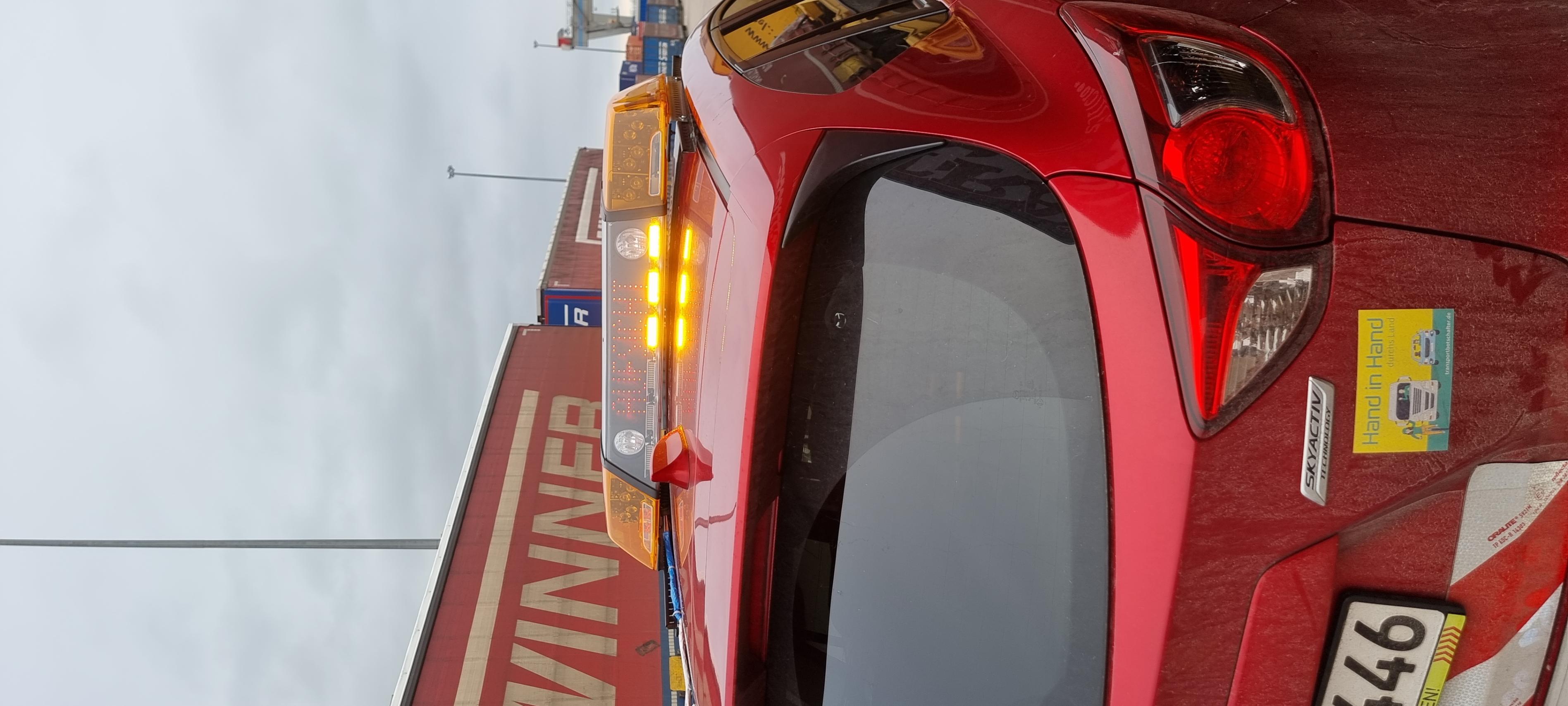 Das ganze ist natürlich eingetragen und nötig da das Fahrzeug in Einem großen Containerterminal läuft. Für die Eintragung wurden Matrix und Lsp so verkabelt, das diese nur funktionstüchtig sind, wenn im Motorraum ein kleiner Schlüsselschalter geschaltet wird. Dies geschieht also nur auf unserem Gelände