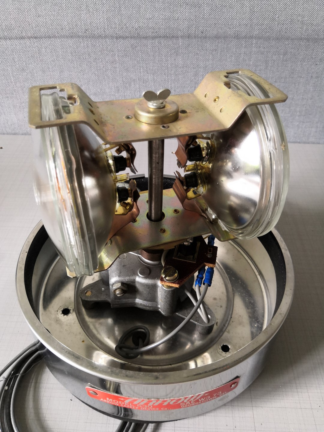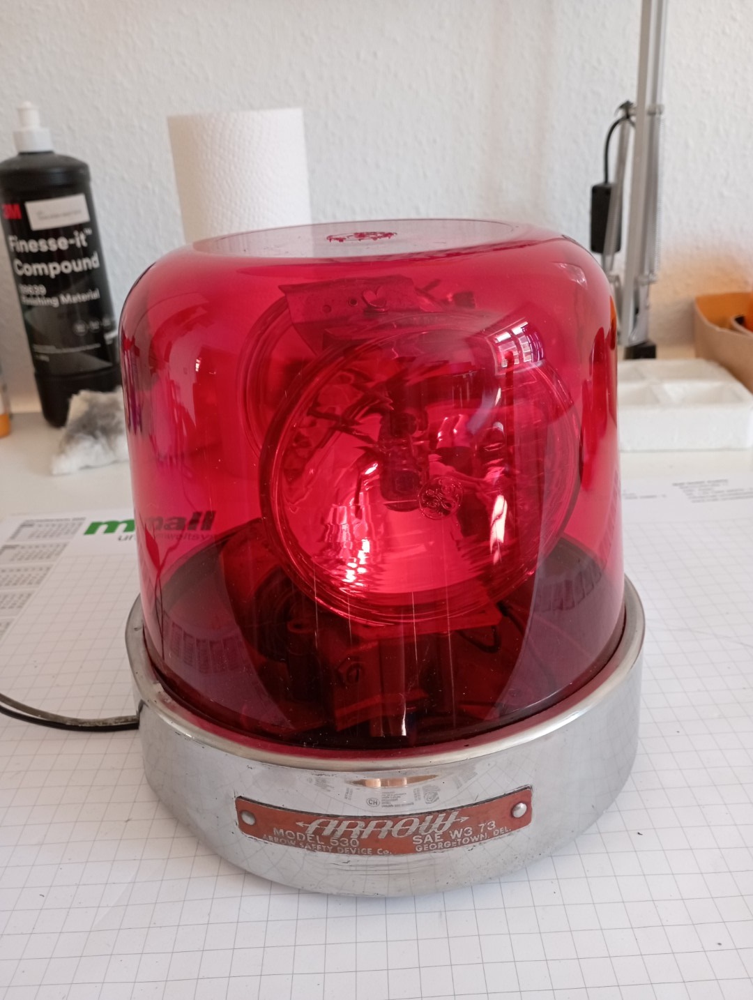 Hersteller: ARROW SAFETY DEVICE, Georgetown, Delaware Model: 550 Lampen: 2x sealed beam 7400 Volt: 12V Produktionsdatum: 17.04.1997 Die 550 ist quasi der Nachfolger der 530 und hat einen kleineren Motor. Ähnlich wie bei der 531 (4x sealed beam) und dessen Nachfolger 551. Die Leuchte selbst macht einen guten Eindruck. Bis auf die Haube vollständig, aber da ich noch einige Stratolite 77 habe, passt das wunderbar. Saubermachen, Dellen beseitigen, Schaft entrosten, Funktion testen, Typenschild aufbessern... Das übliche |