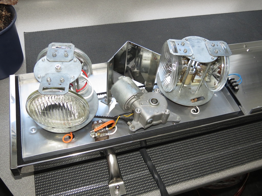 3. Nightprobe: die angesteuerte Seite dreht sich soweit, bis der äußere Lampenhalter seine „Park“-Position erreicht hat. Das nach innen weisende Leuchtmittel im äußeren Lampenhalter ist dabei aus und im nach außen weisenden ist der zweite Glühfaden zugeschaltet. Diese Funktion hat Vorrang und läßt sich unabhängig von den ersten beiden aktivieren und je nachdem welche der anderen beiden Funktionen noch aktiviert ist leuchten eine (nach hinten) oder beide (nach vorn&hinten) Leuchtmittel des Inneren Lampenhalters.