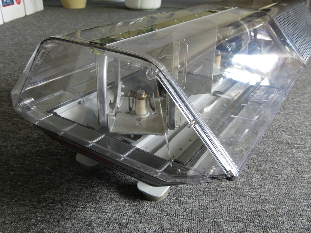 Zustand bei Erhalt: Da er mir persönlich bis nach Hause geliefert wurde, kam es beim Transport zu keinerlei negativen Einflüssen! Der Balken befindet sich in einem guten Zustand. Hat an den Leuchtenhaltern etwas Oxid angesetzt aber das war es dann auch schon. Was bisher geschah: Außer dem Einsetzen von bunten (rot & blau) Leuchtmitteln gab es bisher nichts zu tun. Ansonsten stehen nur ein Wechsel der LP- gegen ein passenderes Mounting Kit und ein kleiner Service an. Fortsetzung folgt ... Aufbau/Technik: Die Basis bildet ein Alu-Profil welches auf der Unterseite mit zwei (der Länge nach verlaufenden) Nuten zur variablen Befestigung der Montagefüße versehen ist. Die einzelnen Komponenten werden direkt auf dem Alu-Profil befestigt. Die Hauben werden, genauso wie die LSP-Abdeckung, von außen mittels Schrauben am Alu-Profil befestigt. Die beiden linken und rechten Lampenhalter werden jeweils über einen Antriebsriemen von einem Motor angetrieben und sind somit miteinander synchronisiert. Zwischen der rechte und der linken Seite besteht keine Verbinndung. Bei den äußeren Lampenhaltern sind die Leuchten im Abstand von 180° und bei den inneren von 120° (240) montiert, wodurch sich unterschiedliche Blinkmuster ergeben. Außerdem erfolgt die Spannungsversorgung zu den sich drehenden Leuchtmitteln ausschließlich über die (Dreh-)Achse (außen - / innen +) und nicht mittels einer Kohlebürste. |