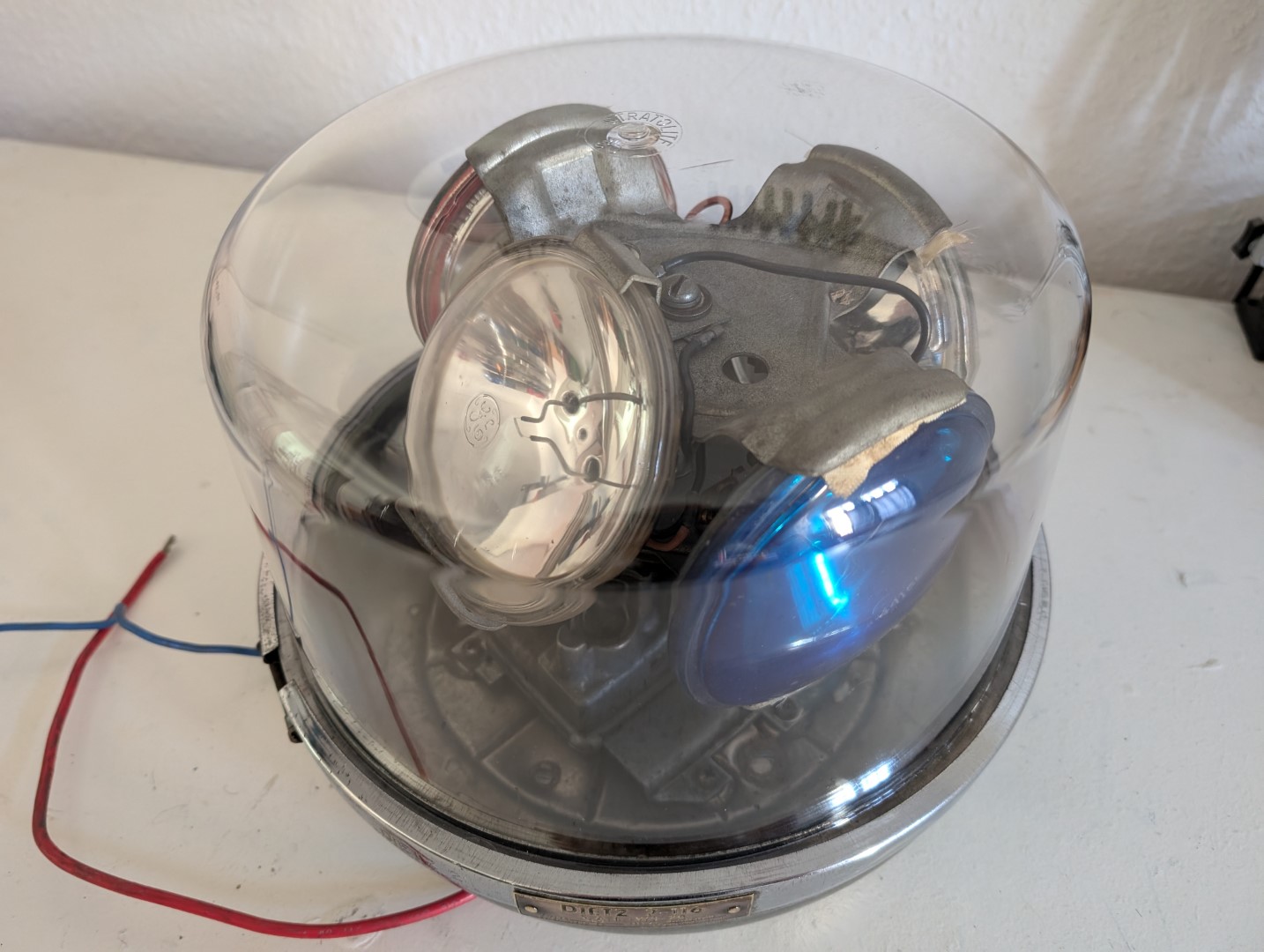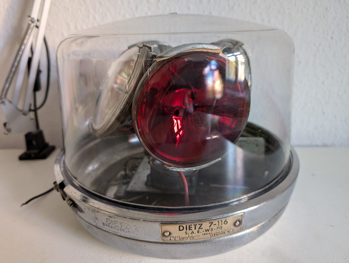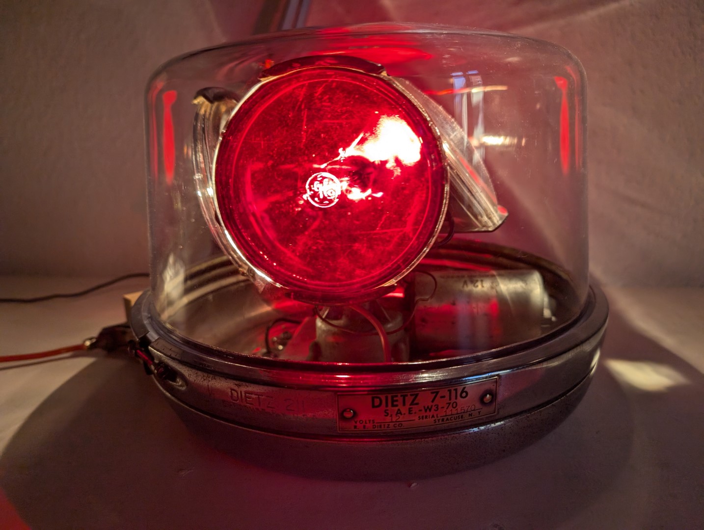 Irgendwann wird dann die richtige Haube und Unterteil vorbeifliegen. Alle Metallteile gesäubert, geschliffen und poliert. Die Pappschildchen als Schutz der sealed beams sind meist weg oder vergammelt, daher auch diese erneuert. Die Verkabelung ist auf zwei Stromkreise ausgelegt, d.h. ich kann rot und klar jeweils separat leuchten lassen. Endmontage nachdem ich alle notwendigen Kabel untergebracht habe. Mit Sonnenlicht noch immer eine schöne Erscheinung. Haube ist NOS, wenn auch nur eine Stratolite 80. Und in Aktion. Da die Version 211 der Dietz Leuchte noch aus verchromten Stahlblech bestand, kann man den angegangenen Chrom natürlich nicht mehr so einfach beheben, wie bei der späteren polierten Stahlblech Version der 7-11. Mein Exemplar stammt aus der Übergangszeit zwischen 211 und 7-11. |