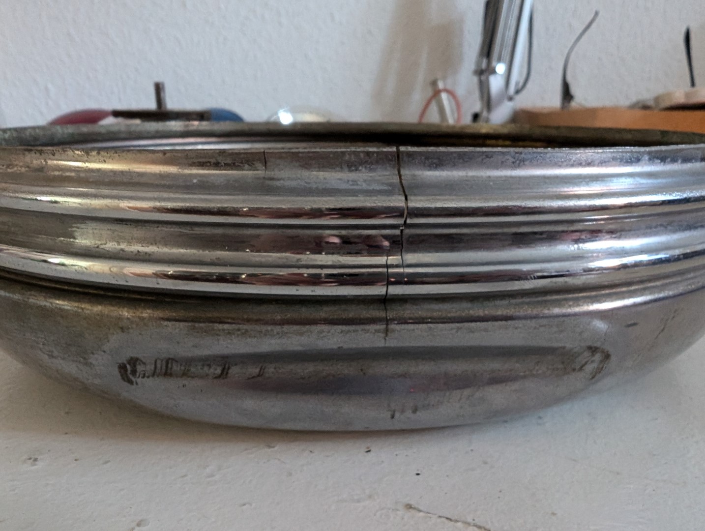 Das hill light hat ja zwei getrennte Stromkreise für die beams. Genau wie beim FS Modell 175 kann man die up/down sealed beams getrennt von den Standard bulbs schalten. Dafür benötigt man natürlich getrennte Schleifkontakte. vorher: nachher: Da das Brettchen krumm ist, habe ich mit Feuchtigkeit und Druck gerade gedrückt und werde es entgegengesetzt einbauen um die Wölbung auszugleichen. weitere Metallteile gereinigt, geschliffen und poliert Ich habe zwar jemanden gefunden, der die Delle in der base entfernt und alles neu verchromt, aber das kostet mich 250€. Daher suche ich vorerst weiter nach einem Ersatzteil. |