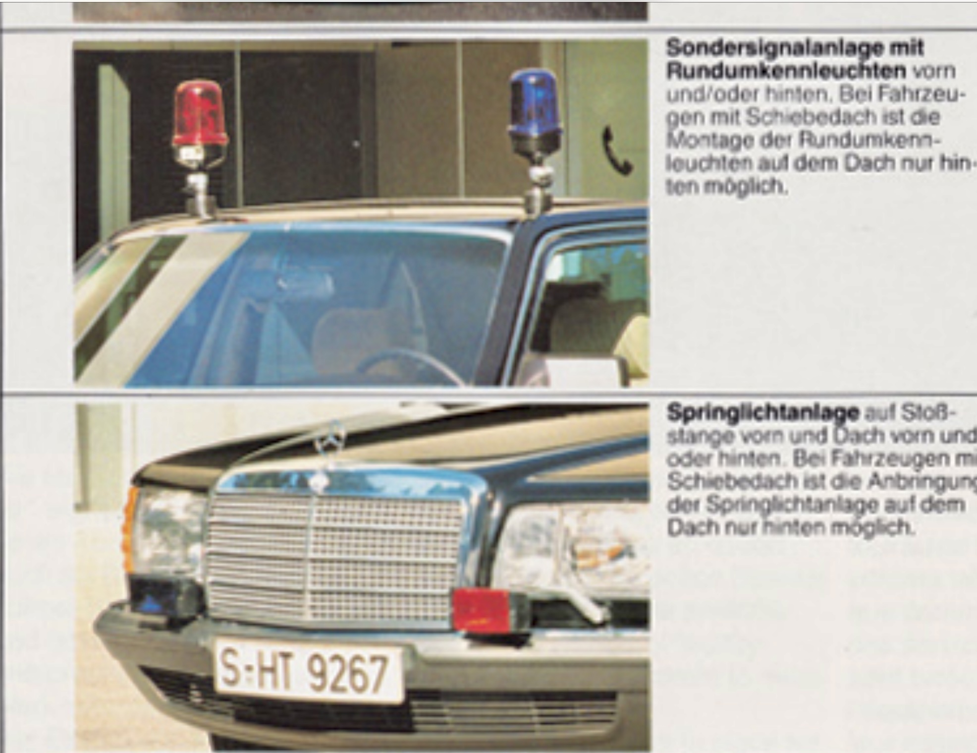 Schon sehr interessant, dass Mercedes bereits 1982 Magnetleuchten angeboten hat. Ebenfalls interessant, die Möglichkeit, rote und blaue Hella KLJ 60 zu bekommen