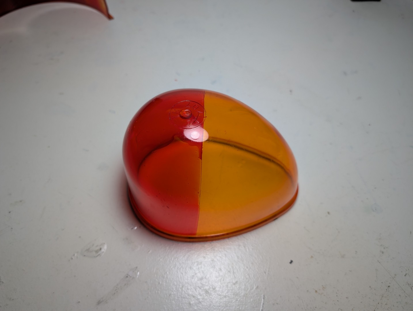 Es gibt ja zwei Möglichkeiten (mit allen Vor- und Nachteilen): zwei Hälften zusammenkleben oder einen amber dome hälftig in transparent rot lackieren.