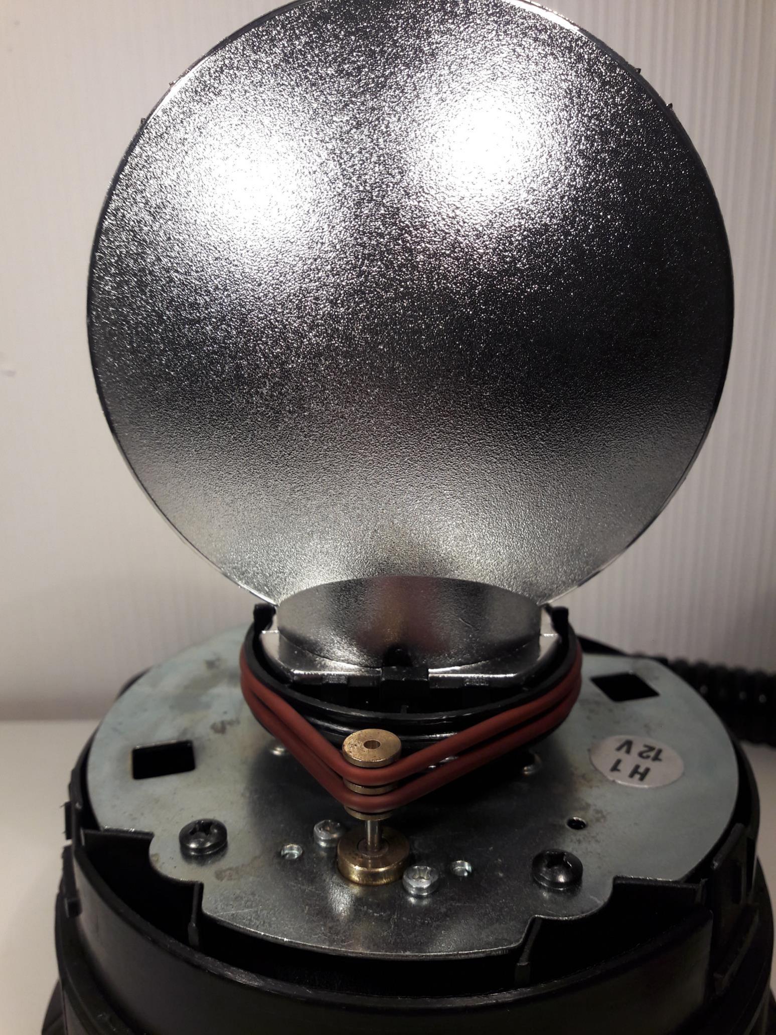 Im Inneren der Leuchte dreht sich ein Kunststoffdrehspiegel um eine stehende H1-Glühlampe.
