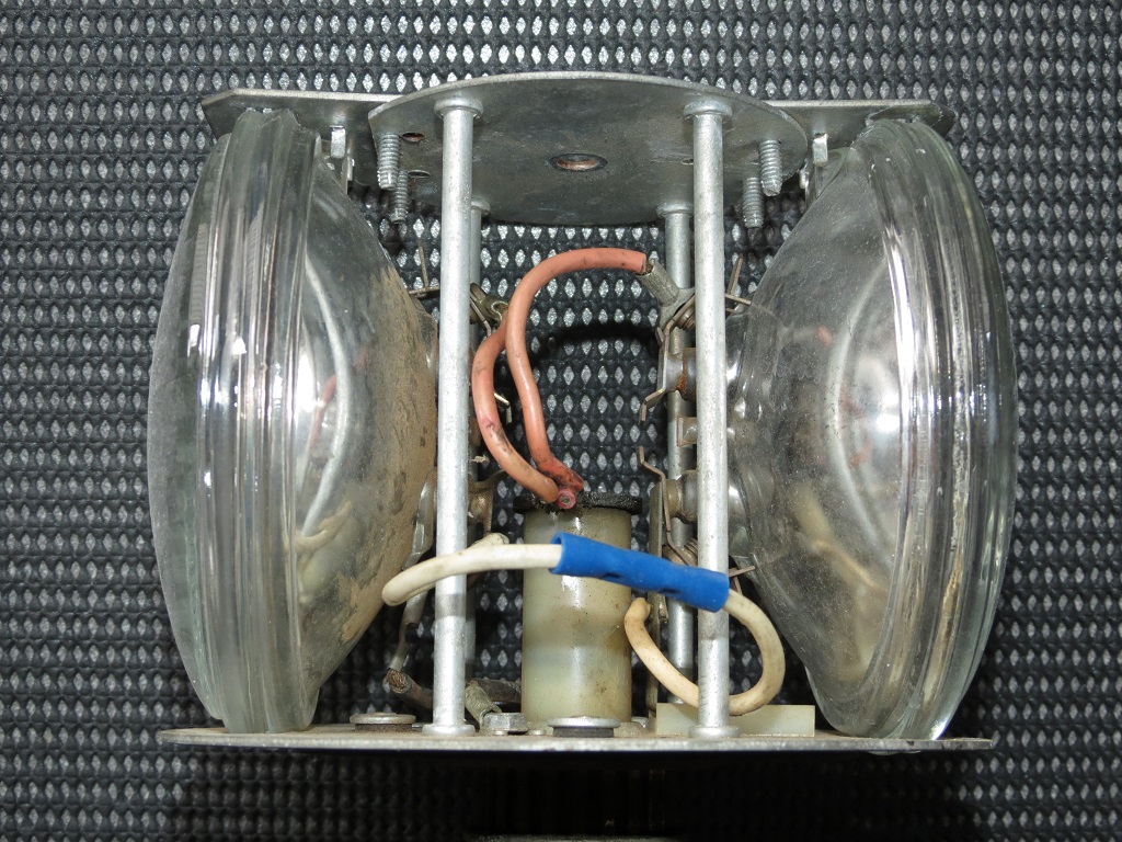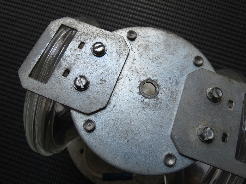 1. Aufgrund der "Abdrücke", zusätzlicher Befestigungslöcher für das Halteblech sowie der Begradigung des oberen Tellers war das auf dem Bild linke Leuchtmittel wohl ursprünglich mal leicht nach innen geneigt montiert, wodurch der Lichtkegel etwas nach oben zeigte.