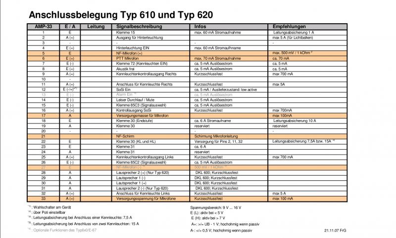 Ich hab gestern Abend mal den Beifahrersitz unseres MTW ausgebaut und mal am Typ 620 gemessen... Im Anhang dazu die Ergebnisse als Excel-Tabelle. In der Tat scheint es so zu sein, dass es da für jeden "Bedarf" verschiedene Basis-Kabelbäume zum 5x0/6x0 Gerät gibt. Ich war ja vom den Plänen für das "Handbedienteil Profi" ausgegangen aber es scheint auch noch einen Kabelbaum "für Stabmikro" zu geben, den wir wohl haben. (Falls jemand die Belegung des 33poligen Steckers genau kennt, könnte er die auch nochmal hier posten, es fehlt noch die Bedeutung der Pins 2,3,4,8,10,13,19,20,24 die bei uns nicht angeschlossen sind.) (Auch die Kennleuchten sind bei uns nicht an die 620 angeschlossen, wie es laut der obigen PDFs sein könnte. Das geht irgendwie extra.) (DBS975LED mit Powerblitz und Heck-KL) Bilder und Tabelle siehe Anhang. Zum Thema: Um das Peiker Stabmikro anzuschließen braucht man die Pins 5,27,6,33 des Typ 5x0/6x0. Verbindet man 6 mit 33 dann "knacken" die Lautsprecher. Daran erkennt man, das die Durchsagefunktion aktiv ist. Schaut Euch die Tabelle mal an. Wer noch Ergänzungen oder Änderungen weiß, immer her damit. Micha |