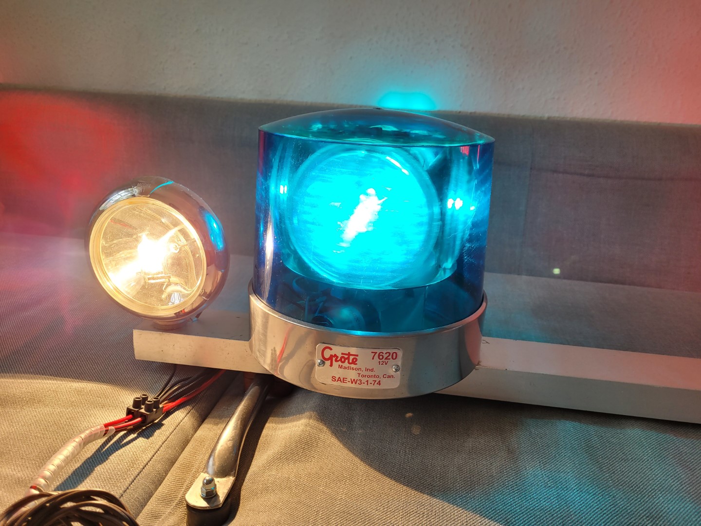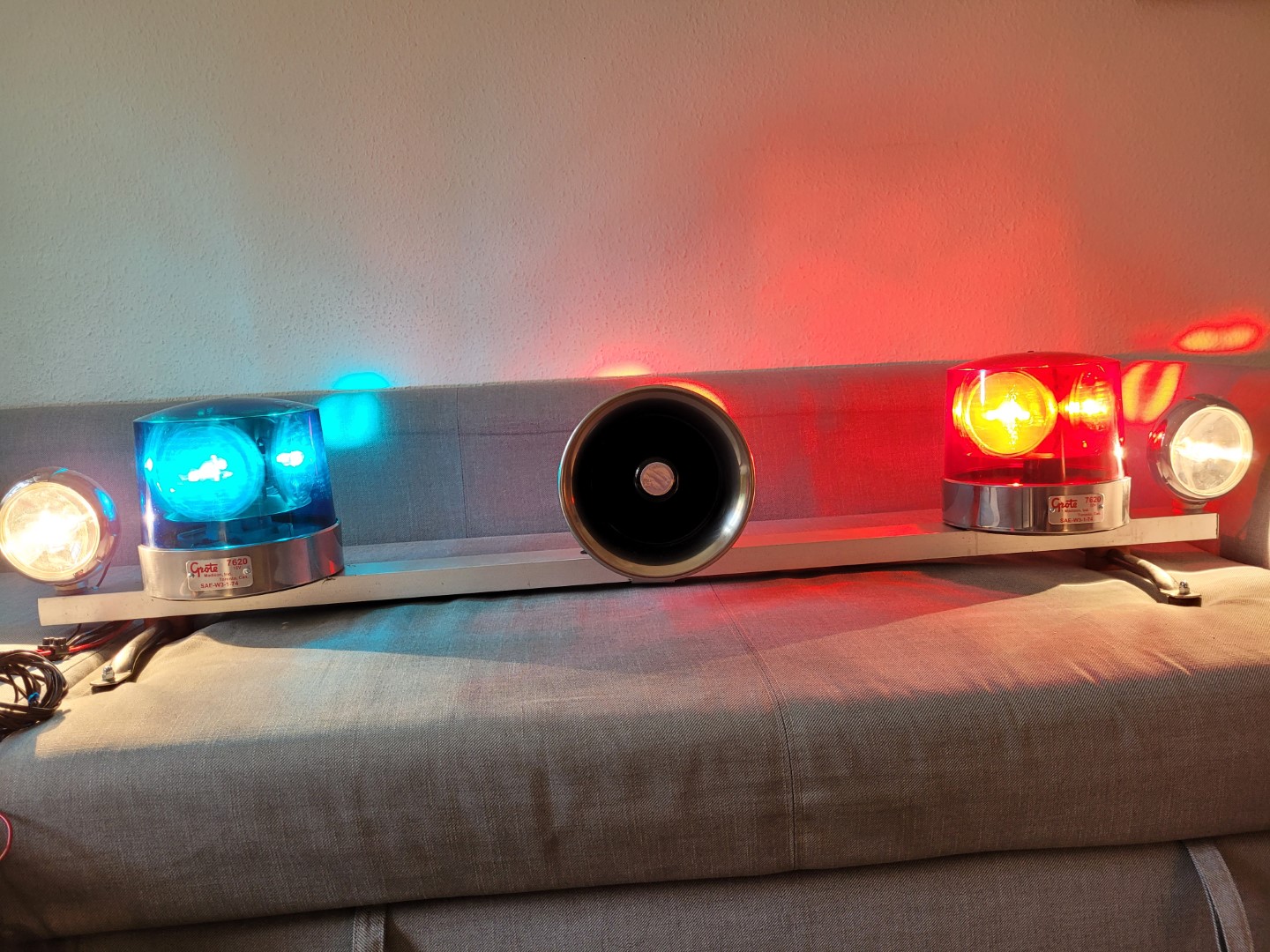 Insgesamt eine interessante Aufgabe für eine seltene lightbar mit konkretem Vorbild. Im Nachhinein war es die richtige Entscheidung das gute Stück wieder im Original aufzubauen. Neben den üblichen Reinigungsarbeiten habe ich auch Neuteile organisert oder Altteile aufgearbeitet. Ein paar Modifikationen gab es auch (Endkappen, Stopfen neben dem Speaker). Die GROTE Leuchten sind teilweise mit neuen Teilen versehen, teilweise restauriert (geschliffen, poliert usw.) oder mit Ersatzteilen aus der Kiste wieder aufgebaut. Sehr viele Schrauben sind neu. Typenschilder sind ebenso neu gestaltet. Und hier in Aktion: Video folgt |
