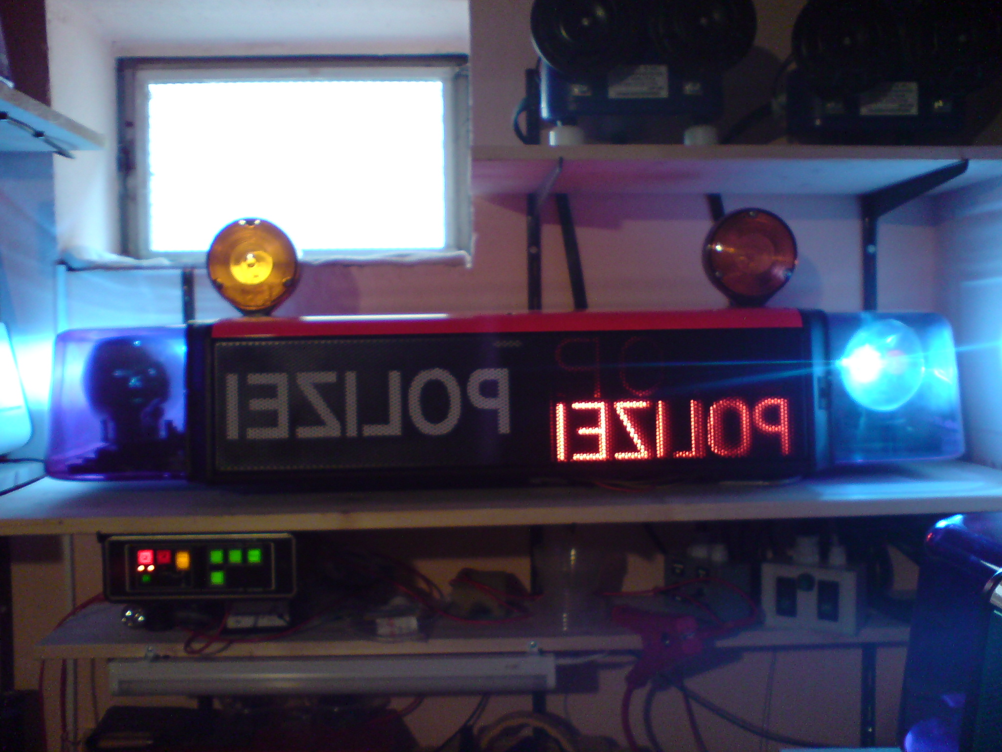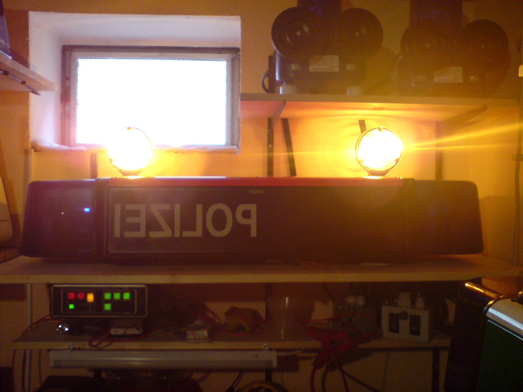zu 7) vermutlich mehrere (Anzahl von Abmessungen abhängig) auf der Blende befestigte gelbe LED-Module (Federal Signal Microled Sputnik [integrierte Elektronik]), synchronisiert, über Bedienteil im Blitzmodus steuerbar