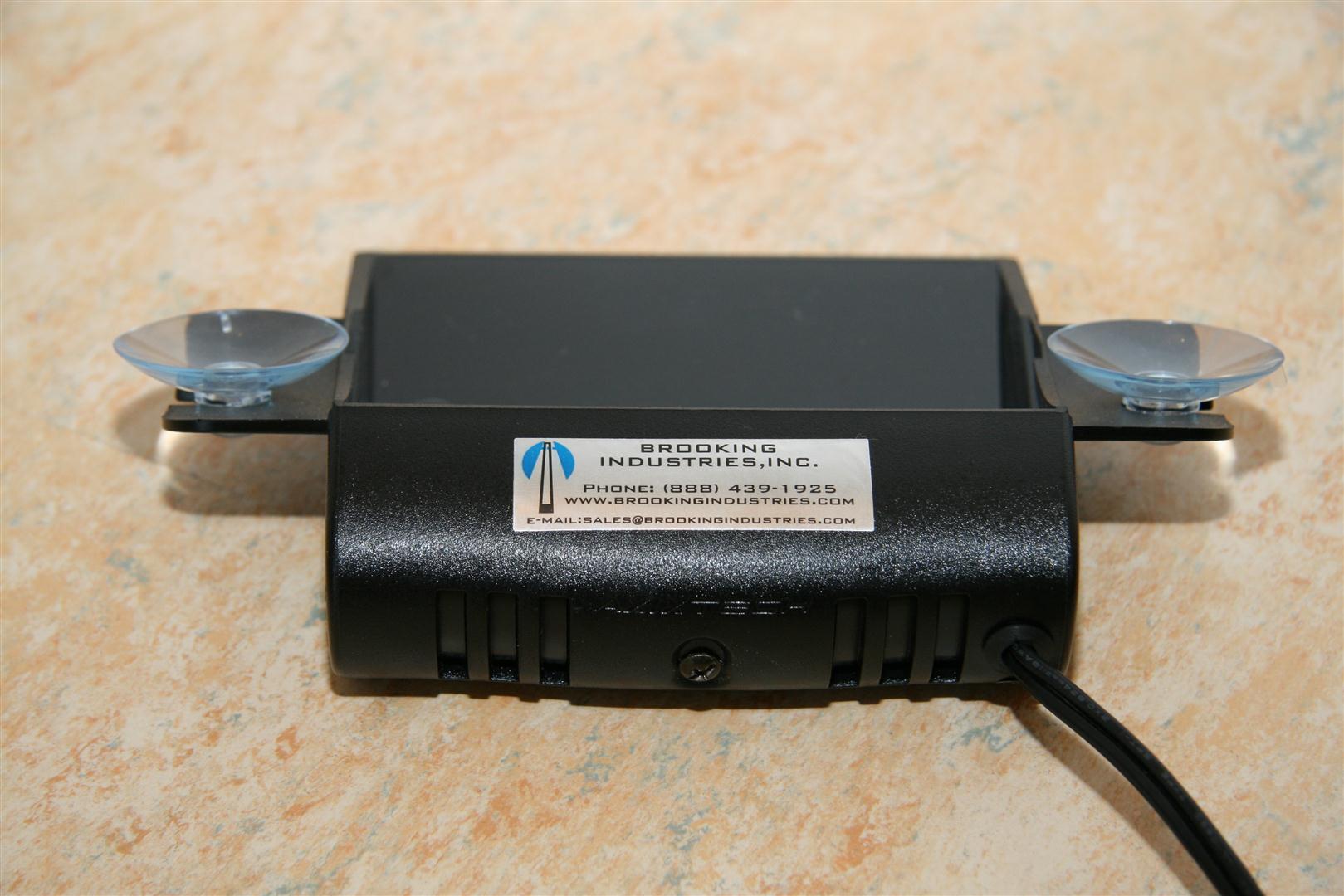 Zur Befestigung an der Scheibe hat er an der Seit zwei Saugnäpfe.