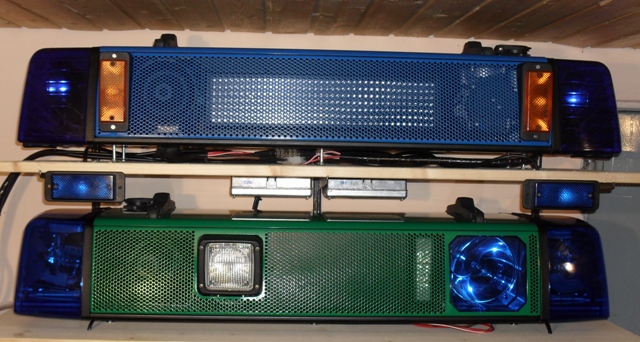 Daher habe ich auch an die BE dieser Anlage meinen Satz Hella BS-X Micro als Frontblitzer angeschlossen, die ich früher mal an meiner Notarzt-RTK 4-SL verbaut hatte (und wo jetzt die Frontblinker angeschlossen sind). Kommt leider auf den Bilder nicht so rüber, ist aber bei Vollast des Netzgerätes ein wahres Blitz-Gewitter, wenn beide Anlagen laufen.
