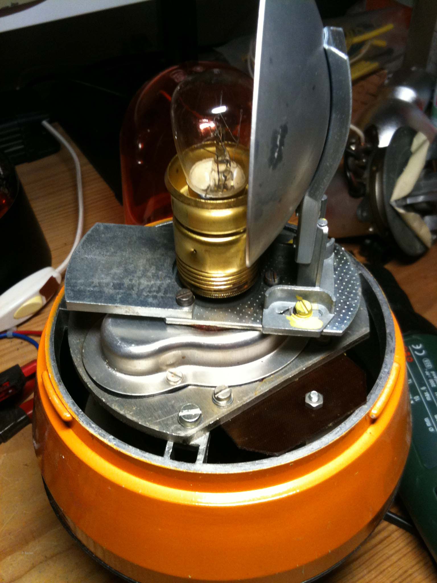 Streiflicht hat mich gerade eben unbewusst auf ein lange bei mir schlummerndes Problem gebracht: Meine Eisemann RWL 90 mit Blechspiegel dreht sich nicht, der Motor läuft aber. Grund: das Ritzel kommt gar nicht ans Zahnrad! Wieso auch immer, die Leuchte ist/ war unbenutzt. Wie kriege ich das Ritzel näher ran? Kennt jemand den Motor? (wieder nur Handyfotos)