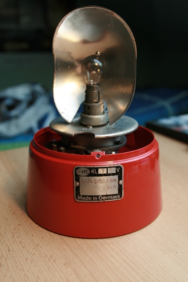 Sie ist von Hella () und besitzt einen Flächenspiegel welcher auf einem Drehteller sitzt und sich um die Lampe dreht. Das ganze wird von einem Motor angetrieben und läuft auf 6V. Das Leuchtmittel ist eine 45W 6V Normallichtlampe (Sockelform: Ba15s). Der Sockel ist aus Metall gefertigt mit einem genieteten Typenschild. Die Haube ist mit einem verchromten Ziering welcher mittels einer Schraube am Sockel gehalten wird befestigt und ist wie man sieht blau.
