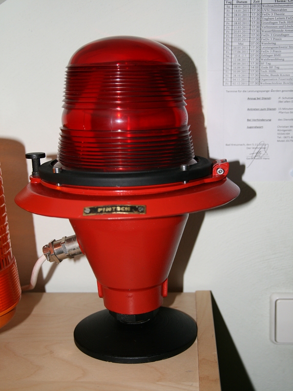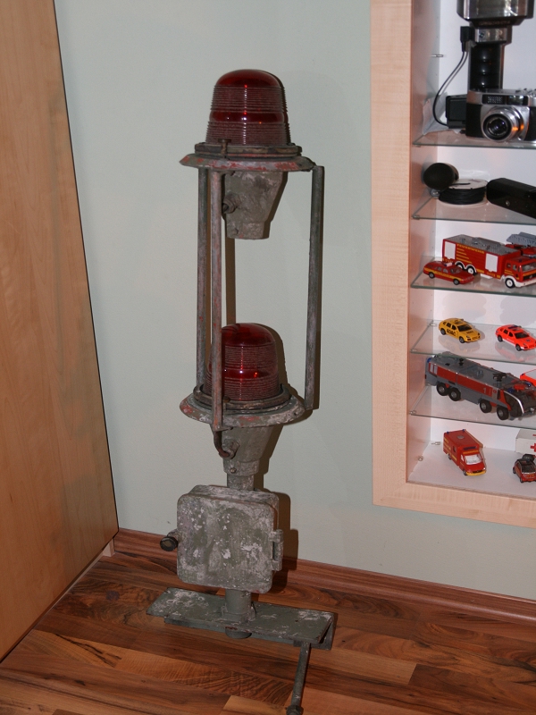 Dies ist zwar keine Sondersignalanlage, aber in einer gewissen weise auch eine Rundumkennleuchte der Fa. Pintsch. Sie Blinkt zwar nicht, aber leuchtet schön. Sie war Jahrelang auf einem Hochspannungsmast hier in der Region eingesetzt (daher auch das Grün), ich habe sie dann vor dem Schrott bewahrt.