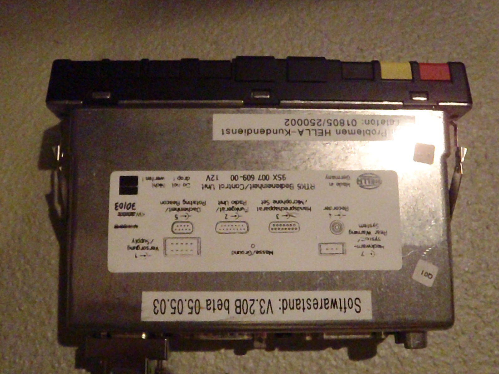 Ein merkwürdiges Bedienteil für die RTK-6 (V3.20B beta) und eine Blitzleuchte, bei der mit Edding "Made in Germany" ausgestrichen wurde, dann der Aufkleber "Made in Romania" angebracht wurde.
