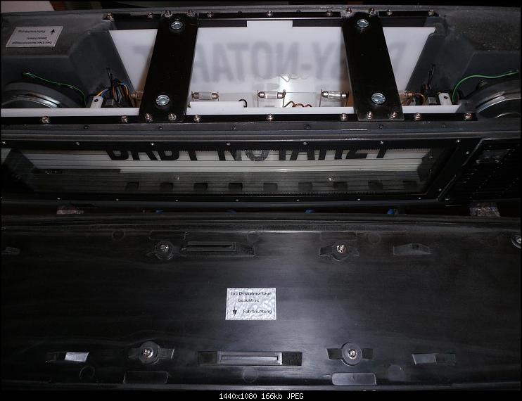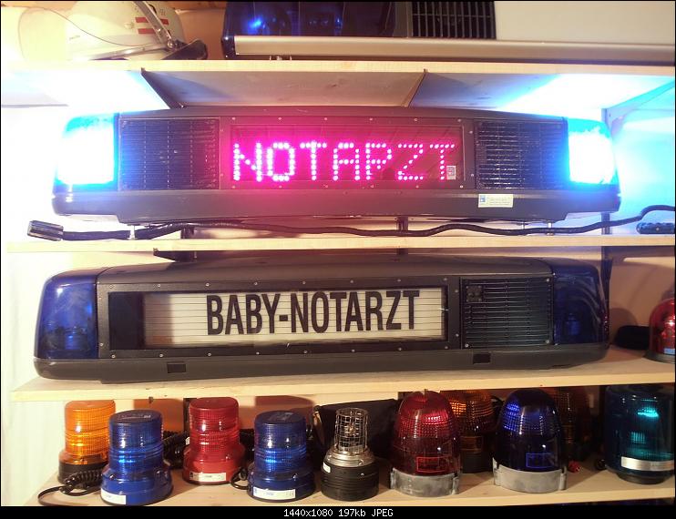 Es handelt sich zum einen um einen Sinfo der Firma Autoradio Becker in der Notarzt-Ausführung. Die Anlage ist ausgerüstet mit zwei Drehspiegelleuchten, zwei Lautsprechern in Fahrtrichtung sowie einer hinterleuchteten Mittelbeschriftung. Die Hinterleuchtung ist durch Sofitten realisiert. Der Schriftzug zeigt vorder- wie rückseitig die Schrift BABY-NOTARZT in schwarzer Normalschrift auf milchweissen Blenden. Sowohl die Sicherheitsglasscheiben wie auch die Lautsprechergitter der Anlage sind beheizbar, dazu jedoch später mehr. Der Balken kam in hervorragendem Zustand zu mir.