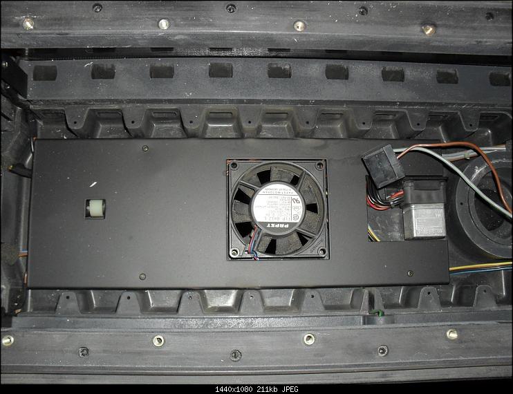 Das LSP-Gitter an der Rückseite ist nur eine Attrappe und vollständig geschlossen. Ob es auch Anlagen mit drei LSP gab, kann ich leider nicht sagen. Von der LSP-Größe und den Platzverhältnissen her wage ich es zu bezweifeln. Hier sind zwei Buchsen angebracht, über die ein 12 V-Anschluss für optionales Zubehör zur Verfügung steht. Jede Buchse ist mit einem fummeligen Stopfen verschlossen. Da bei meinen Anlagen scheinbar nie der Anschluss genutzt wurde, sind noch alle Stopfen vorhanden.
