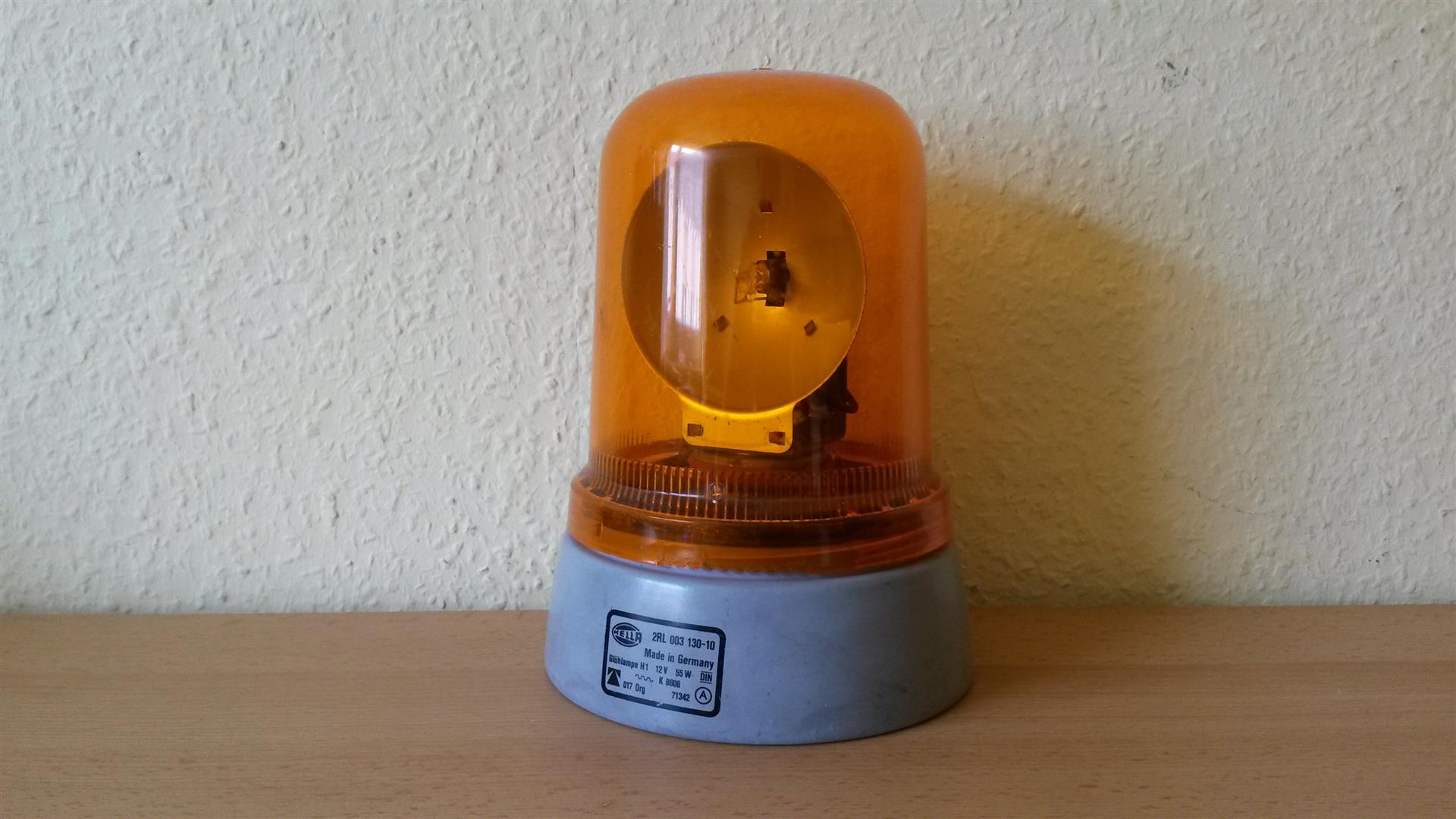 Eine einfache Drehspiegelkennleuchte von Hella ist die KL 600. Es handelt sich um eine Kennleuchte zur Aufsteckmontage (Bauform A). Wie immer ist im Parabolreflektor ein H1 Halogenleuchtmittel. Bewegt wird der Reflektor von einem Doppelriemenantrieb. Hella KL 700 Hierbei handelt es sich um die erste Version mit gesteckter Drehspiegeleinheit und Rastmotor. Die Bauform dieser Kennleuchte ist B1, also Festmontage. Hier gilt natürlich das Selbe wie für die KL 600: Mitdrehendes H1 Leuchtmittel im Parabolreflektor, bewegt durch einen Doppelriemenantrieb. Das Typenschild sieht so aus. Im Hintergrund sind die beiden roten Riemen zu sehen. Vergleich orange / blau Die orange KL 600 hat eine besondere Haube. Mehr dazu hier.