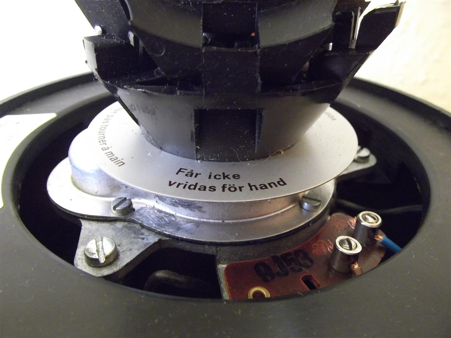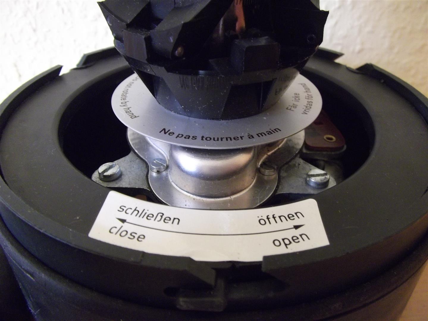 Unter dem Linsenkorb steht in deutsch, französisch, englisch und schwedisch, dass man die Linsen nicht von Hand drehen soll. Es wird außerdem erklärt, wie die Lichthaube abgenommen werden kann.