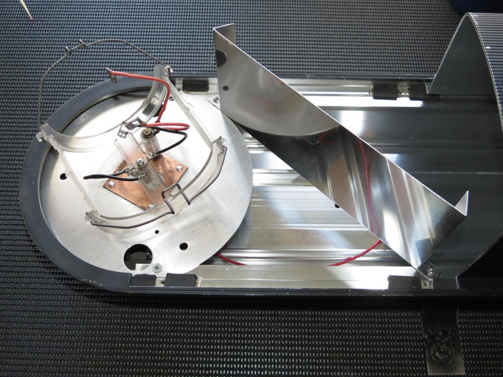 Die Lampenhalter sind Kunststoff und haben (anders als bei der Alu-Ausführung) zwischen den Aufbnahmepunkten der Haltebügel noch zusätzliche Streben. Jeder Dreher hat seinen eigenen Motor, welche über ein Schneckengetriebe die Drehachse antreibt.