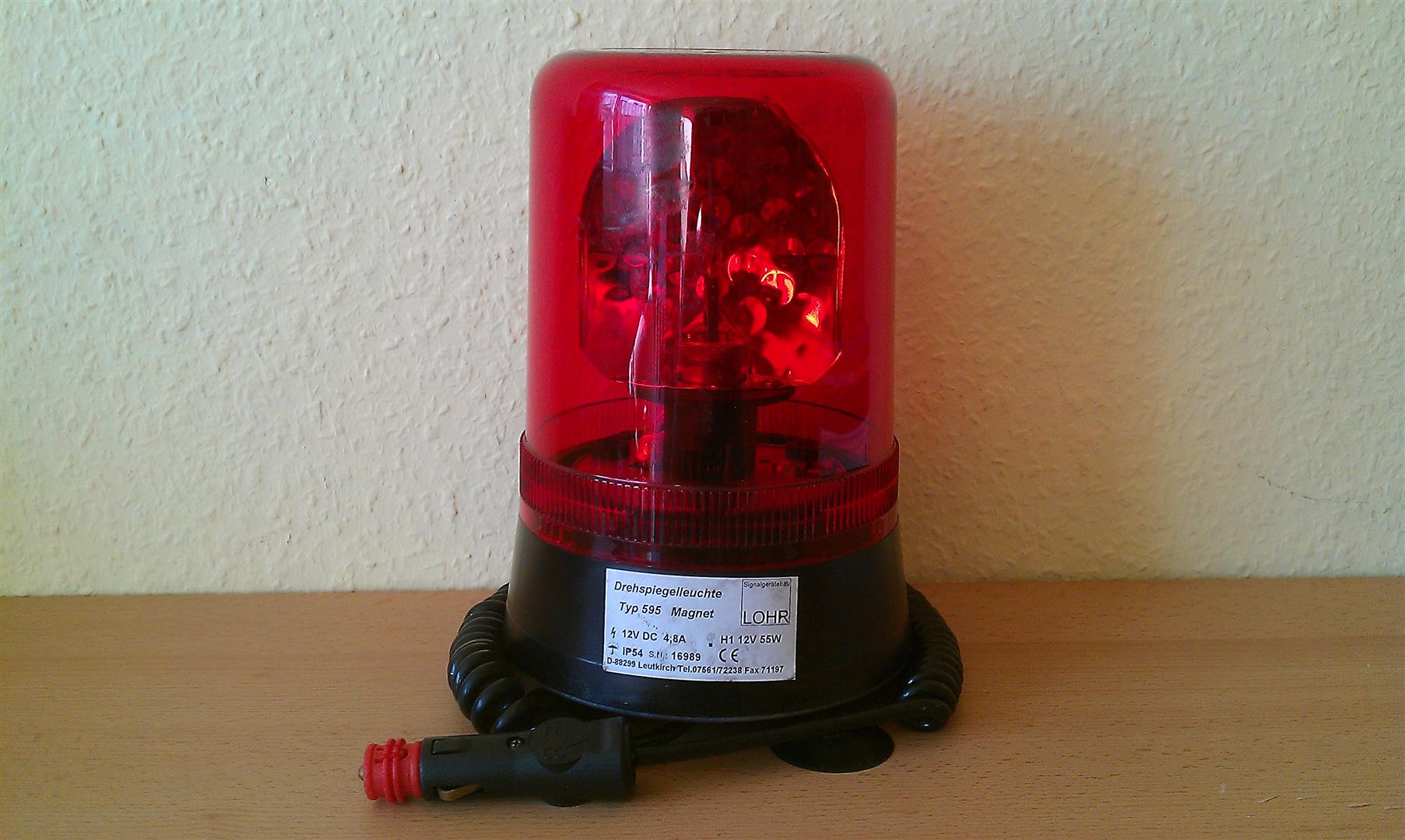 A.E.B. Kennleuchten A.E.B. 595M Die in Belgien hergestellte A.E.B. 595 M ist eine Drehspiegel-Kennleuchte in Halogentechnik. Um die stehende H1 Halogenlampe dreht sich ein Facettenspiegel. Die Leuchte verfügt über einen erstaunlich leisen Schneckenantrieb. Diese Magnetkennleuchte wird mittels eines Ringmagneten und vier Saugnäpfen auf dem Dach gehalten. Die Stromzufuhr erfolgt über einen Zigarettenanzünderstecker mit Spiralkabel. Rote Kennleuchten werden in Deutschland häufig zur Kennzeichnung der Einsatzleitung verwendet. Die A.E.B. Kennleuchten werden unter anderem von Lohr vertrieben. A.E.B. 590 Die A.E.B 590 ist von der Technik her identisch mit der 595 M. Jedoch ist die 590 keine Magnet-Kennleuchte, sondern eine Aufsteck-Kennleuchte. Die A.E.B. 590 ist mit blauer Haube in Deutschland eher selten anzutreffen. |